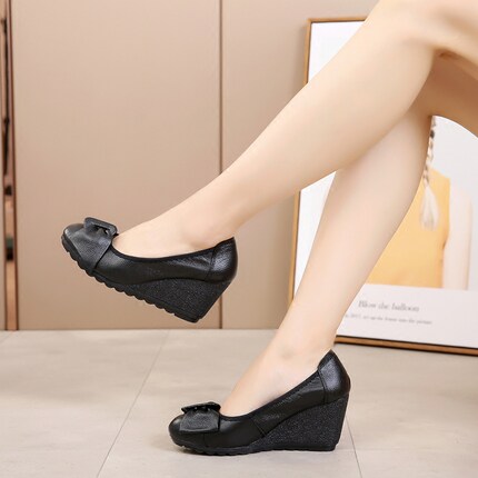 真皮女鞋坡跟单鞋舒适牛筋软底圆头蝴蝶结护士鞋休闲女鞋子工作鞋