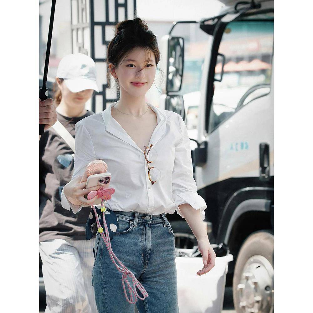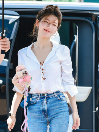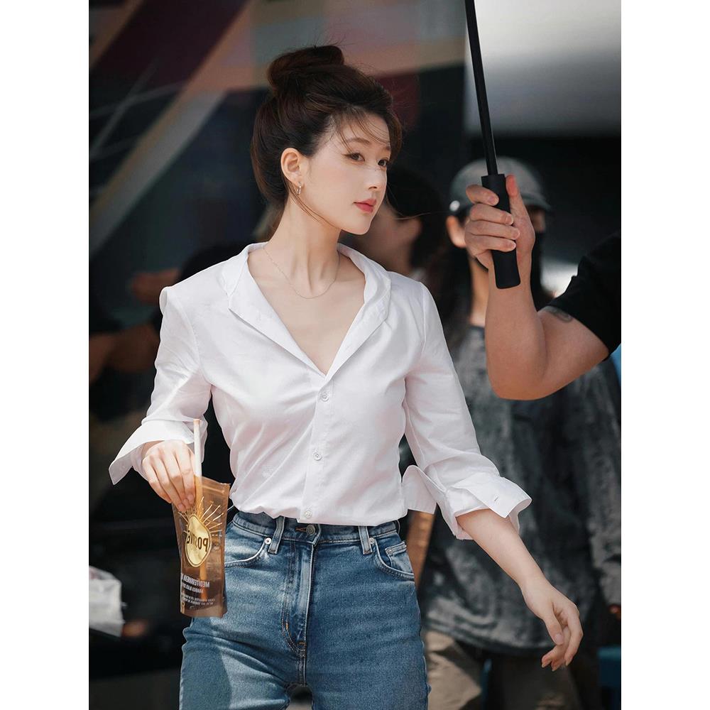 法式白色v领长袖衬衫女早春新款设计感小众气质职业通勤百搭上衣