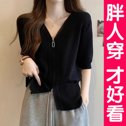 大码V领冰丝短袖T恤女洋气百搭拉链体恤上衣胖mm遮肚子针织衫春秋