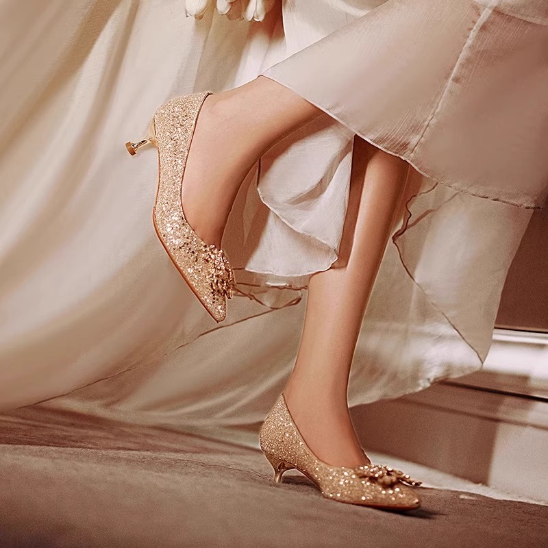 秀禾婚纱两穿新娘鞋女2025新款不累脚伴娘法式水晶高跟鞋尖头细跟