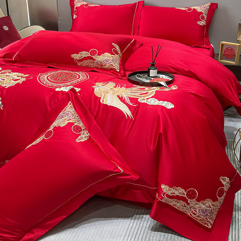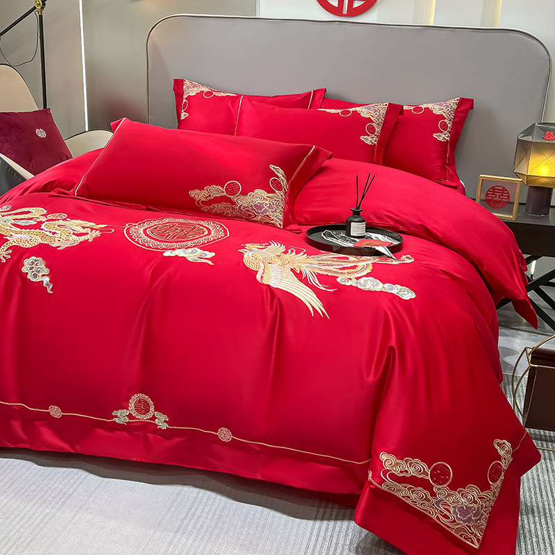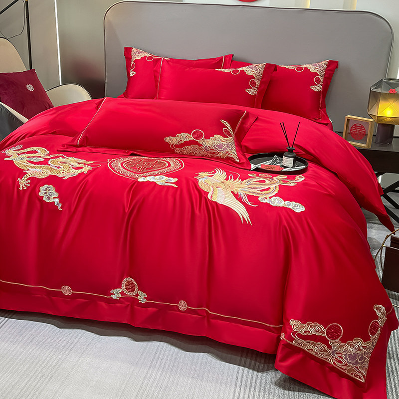 中式四件套简约床单大红色结婚