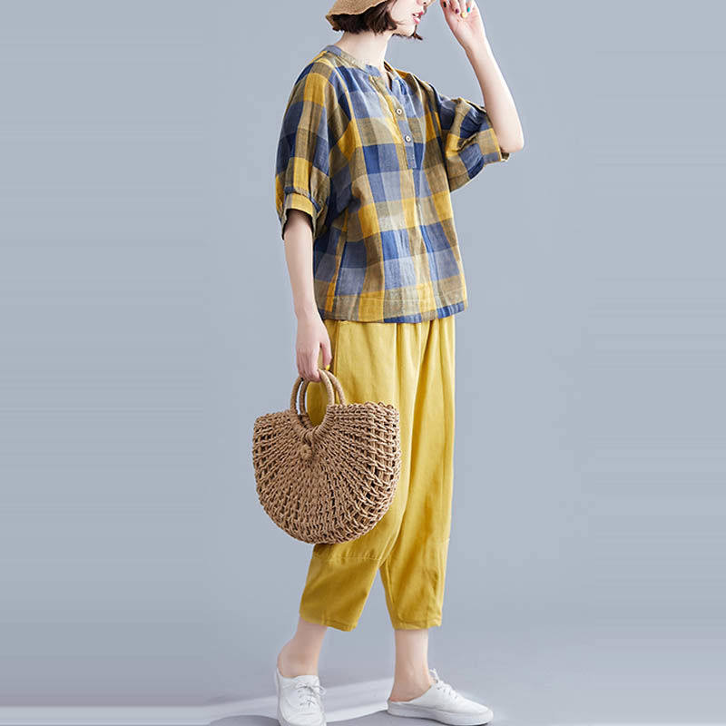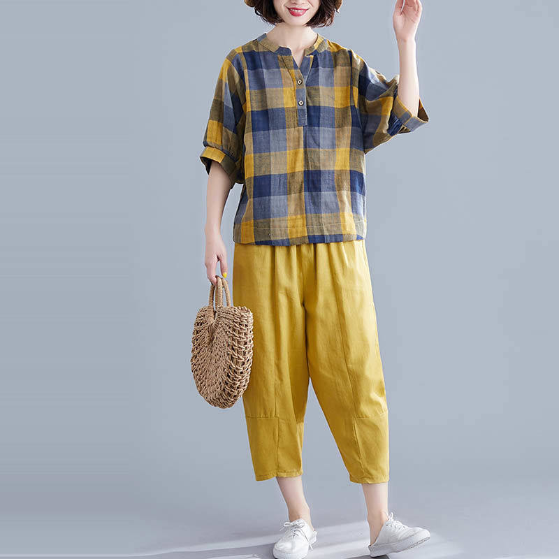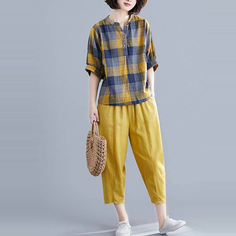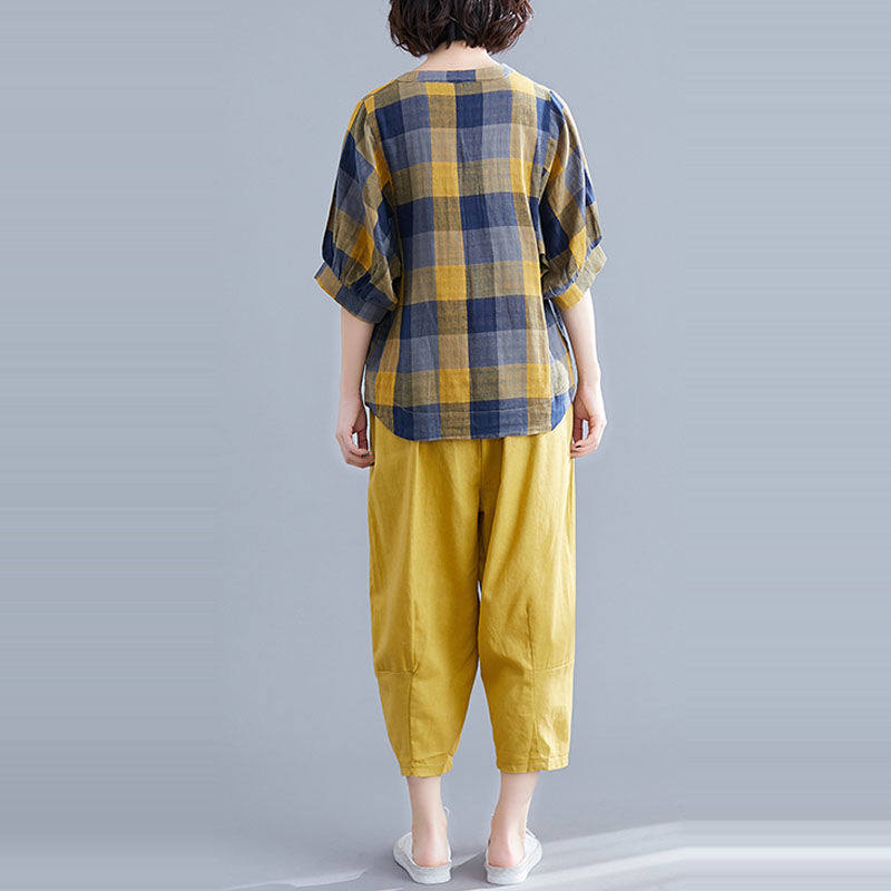 夏季新款套装中老年妈妈大码女装短袖t恤棉格子上衣九分裤两件套