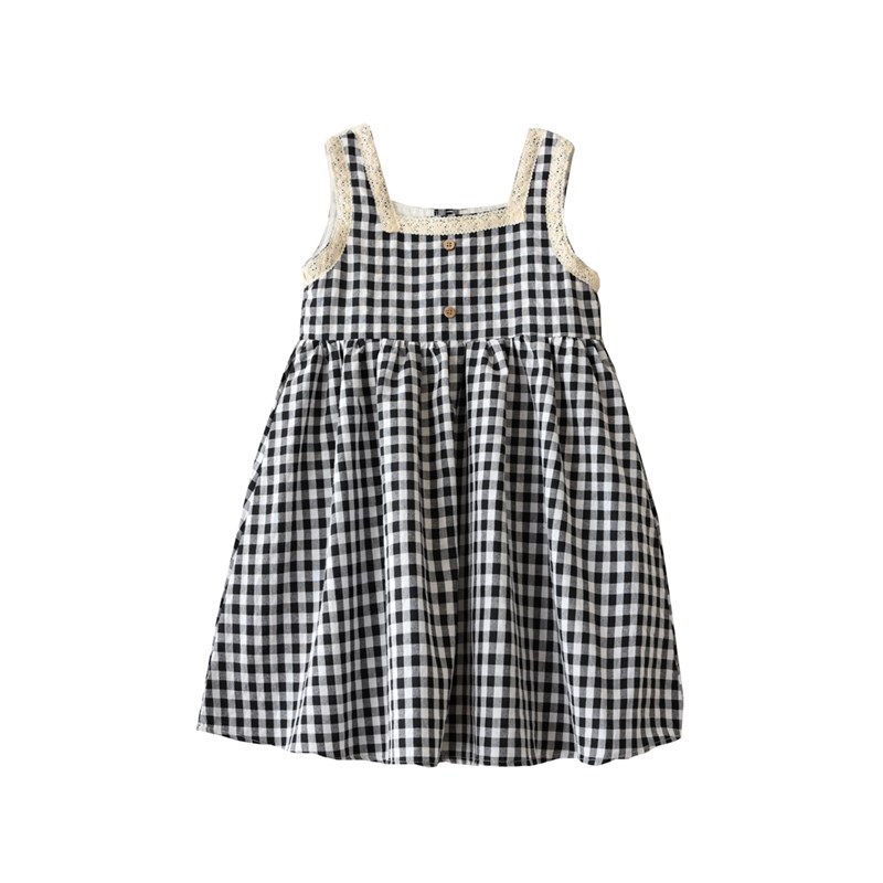 森系 儿童黑白格子连衣裙 女童小方领无袖背心裙 中大童夏款童装