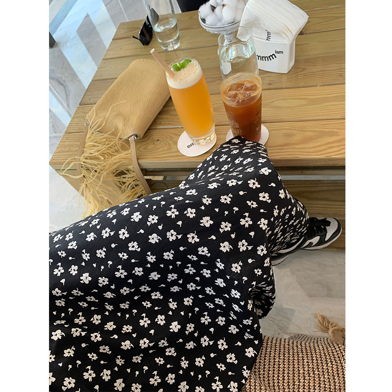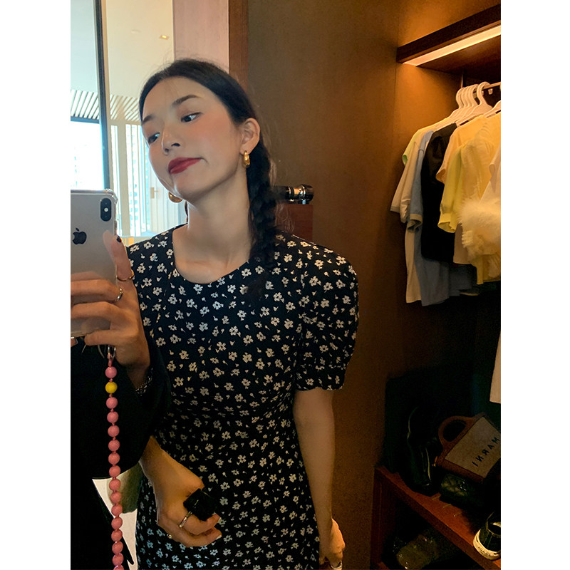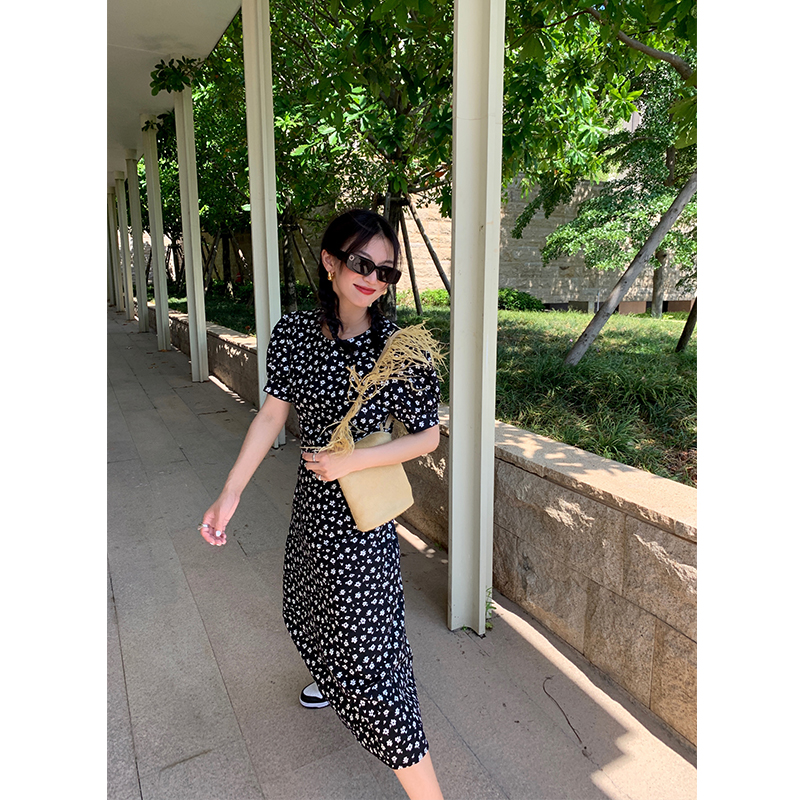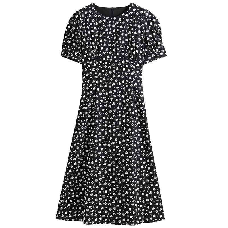 落落狷介连衣裙女夏小个子2025年春夏新款韩版黑色碎花收腰小黑裙