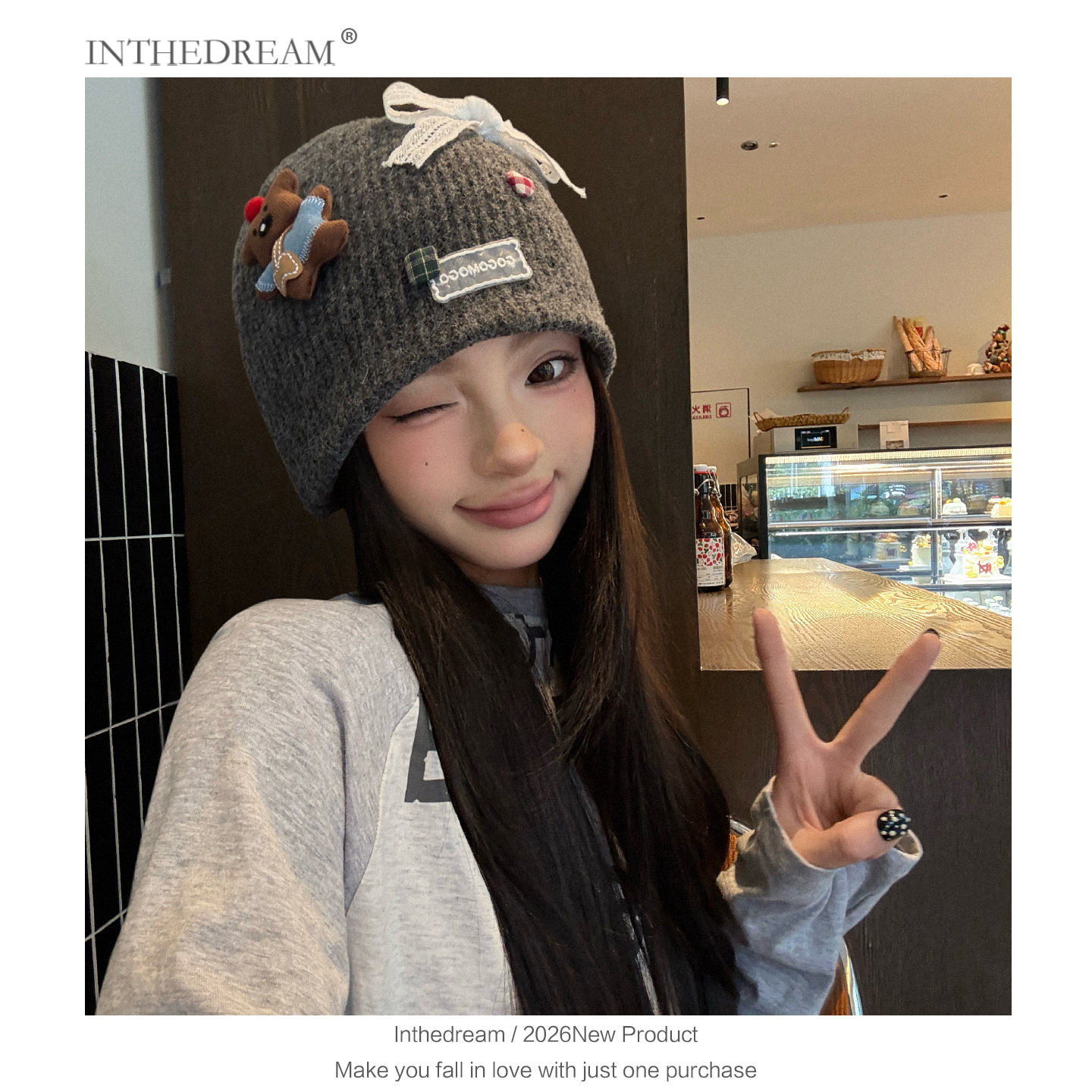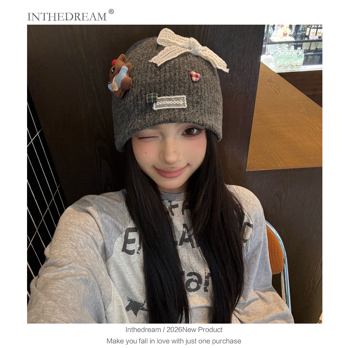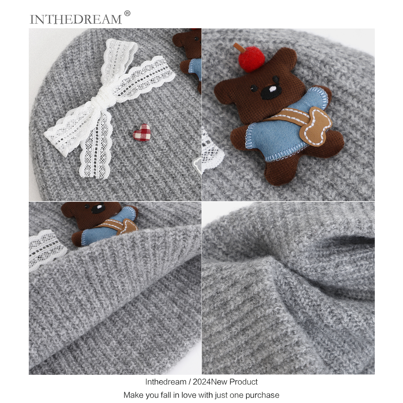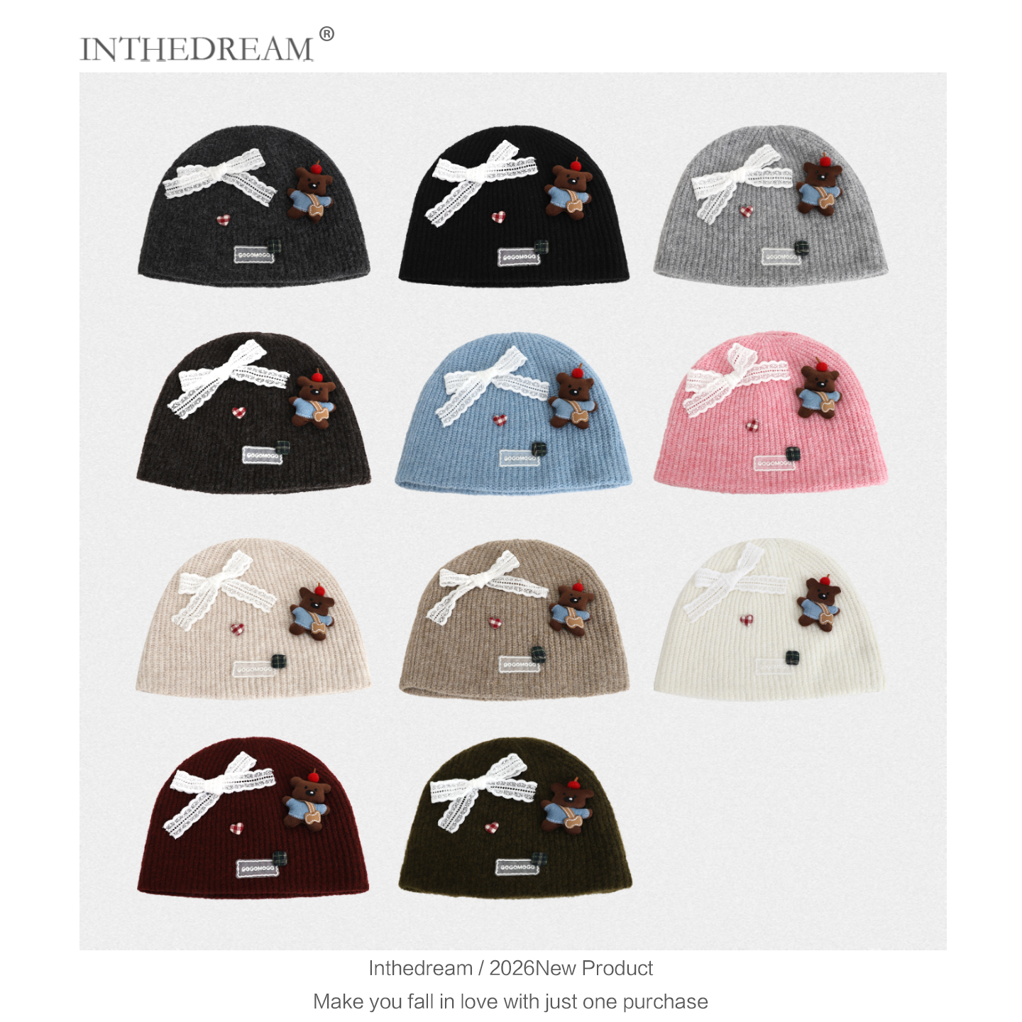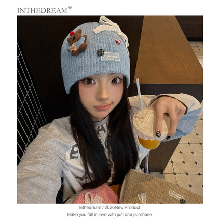 秋冬季卡通小熊针织帽女搞怪可爱蝴蝶结毛线帽保暖包头帽套头帽子