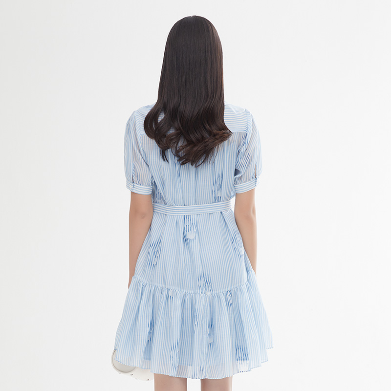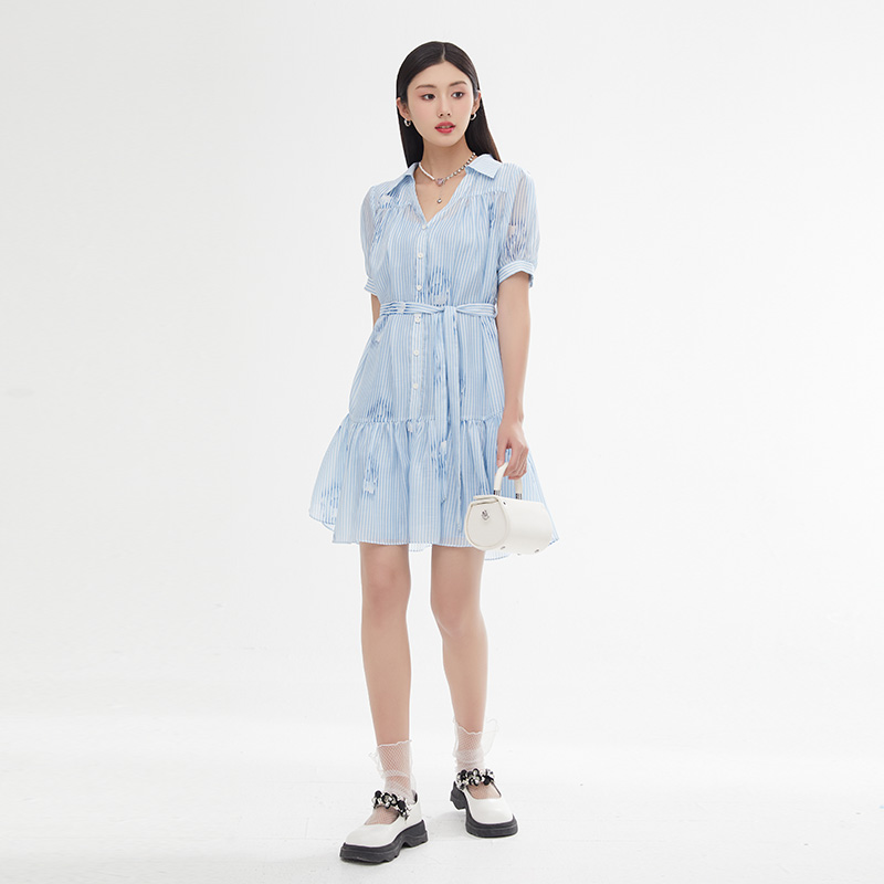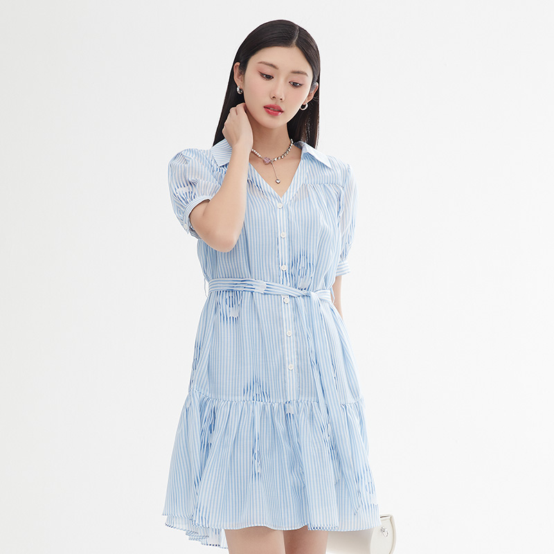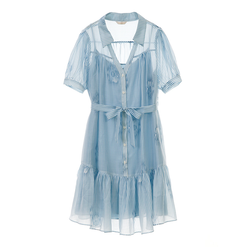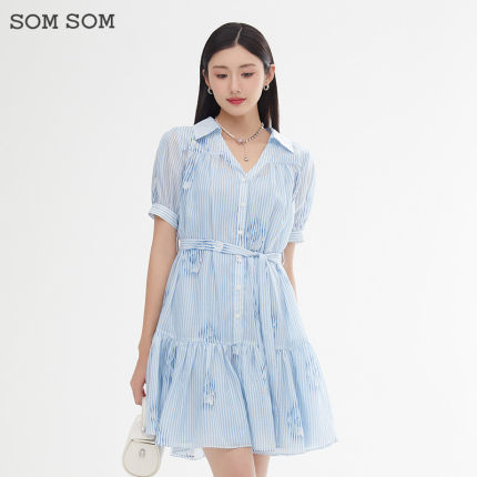 SOMSOM/索玛假两件竖条纹夏季吊带雪纺印花减龄气质短袖连衣裙女