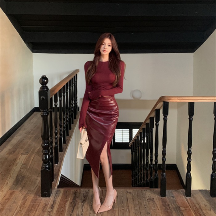 安可拉红色圆领弹力修身长袖打底T恤女高腰性感包臀开叉皮裙套装