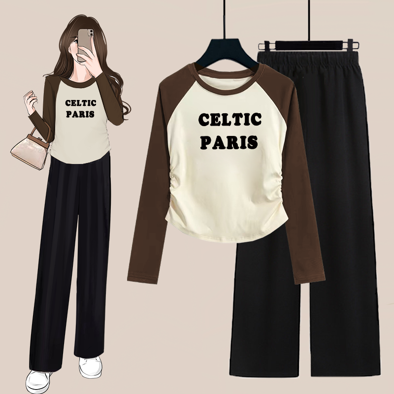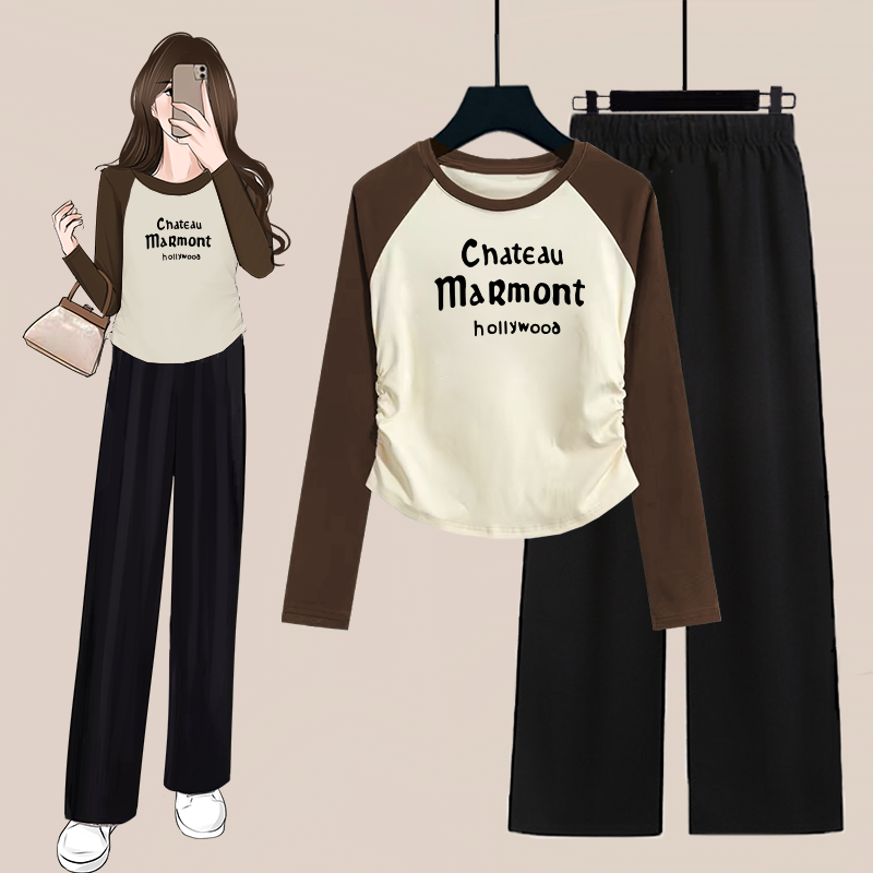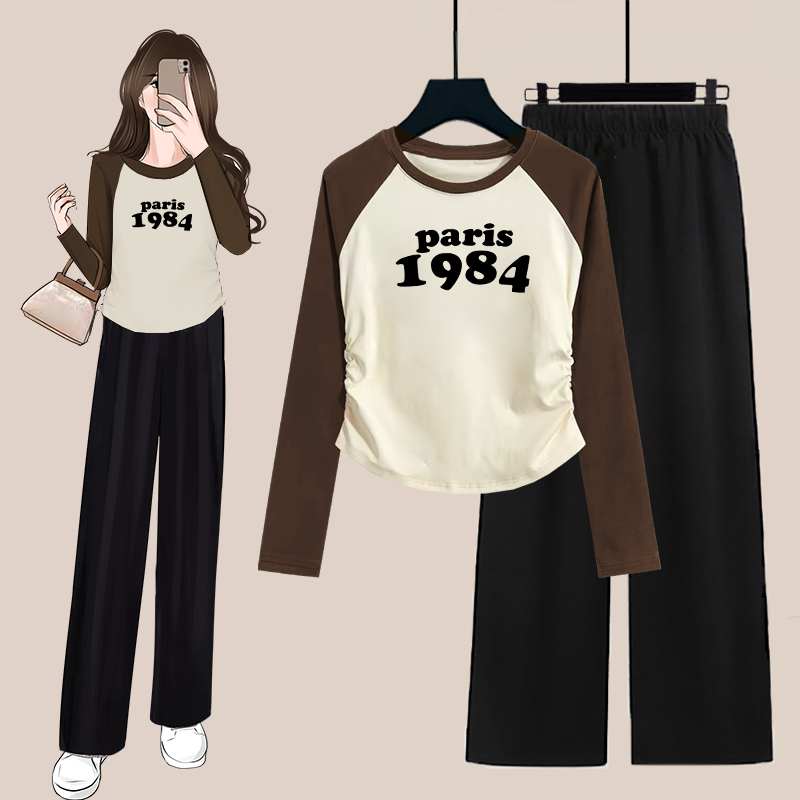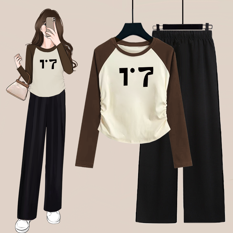 单/套装秋季时尚短款褶皱撞色长袖T恤女上衣+高腰阔腿裤两件套装