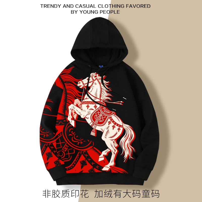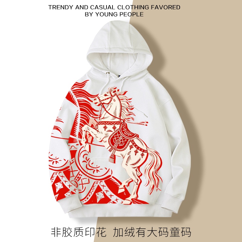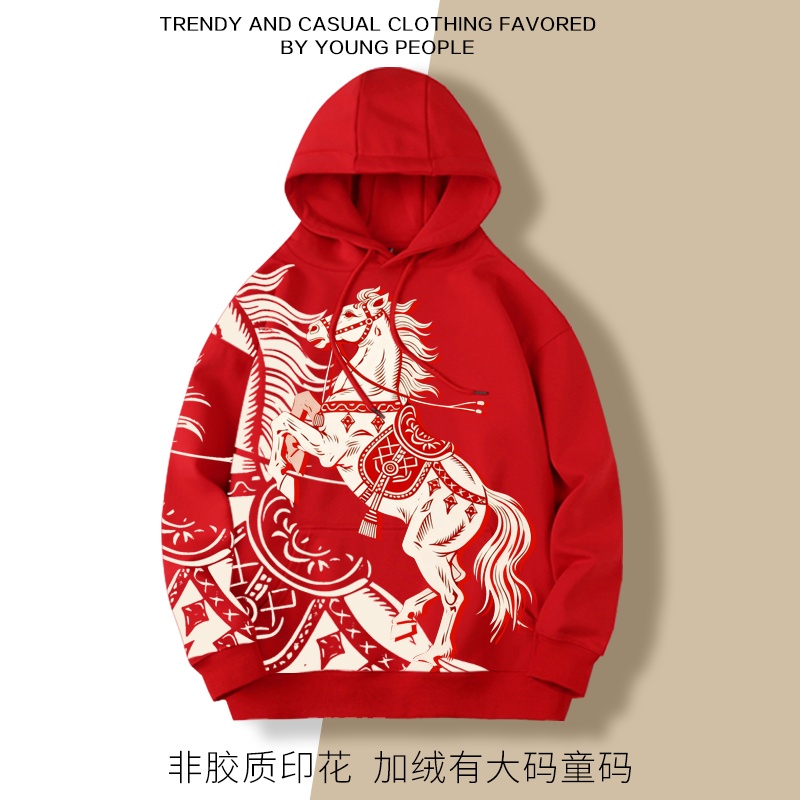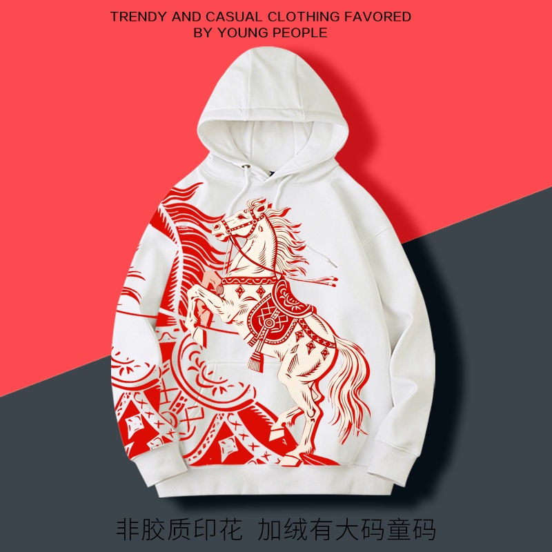 马年本命年马到成功剪纸加绒连帽卫衣宽松休闲男女大码上衣有童码