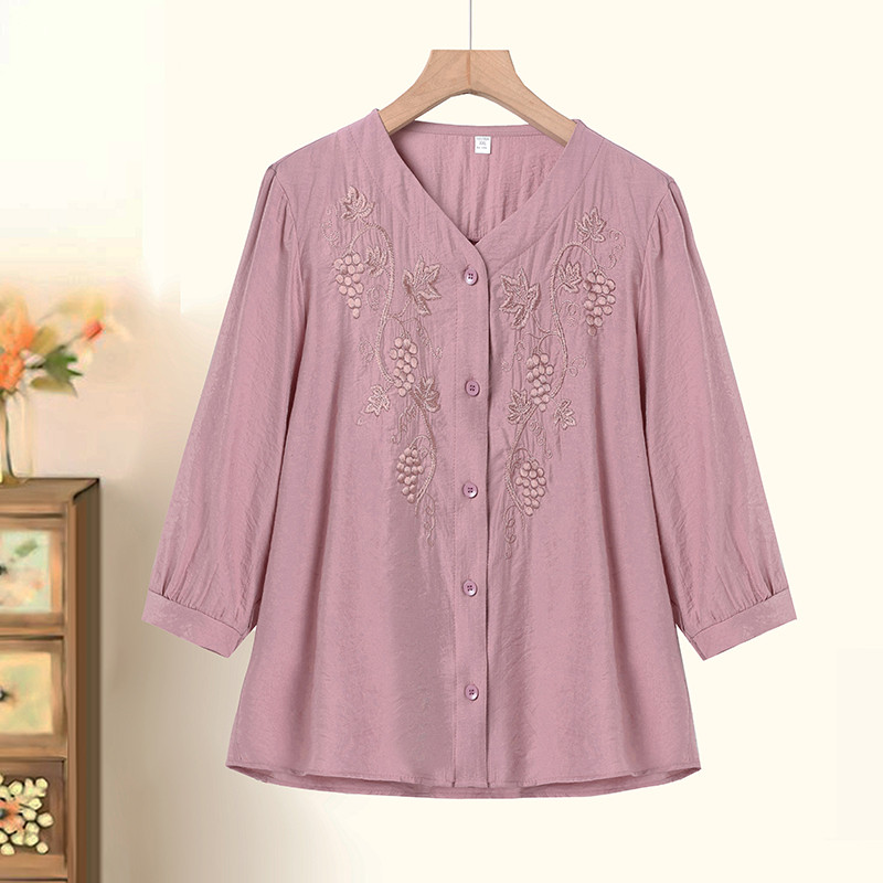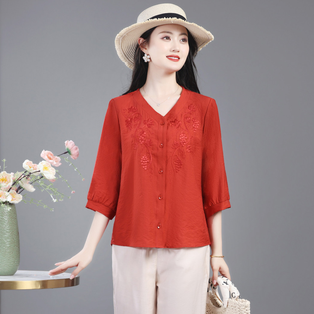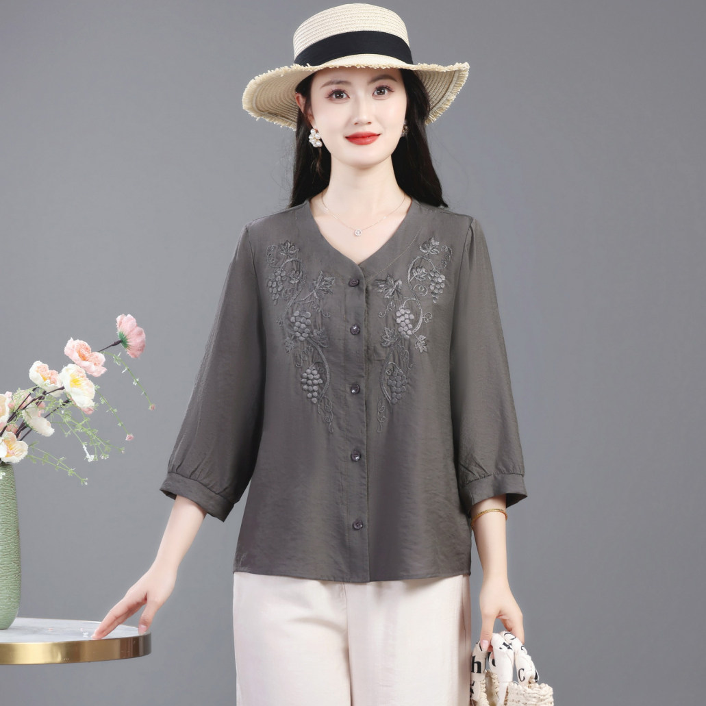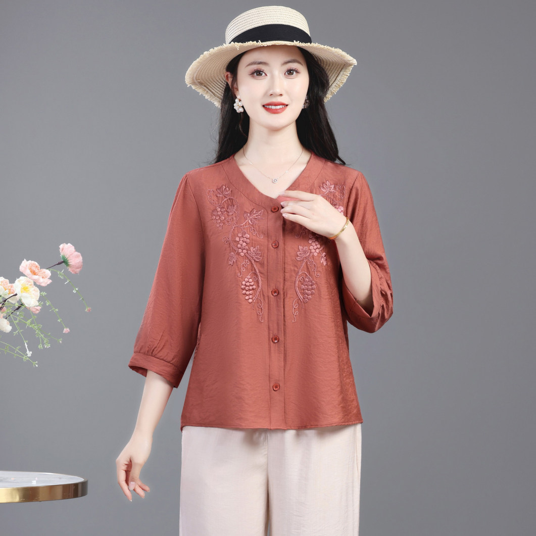 中年妈妈夏季洋气棉麻衬衫七分袖上衣中老年女装春夏休闲绣花小衫