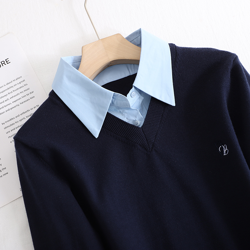 2025春季新款时尚百搭套头学院风假两件衬衫针织衫女上衣