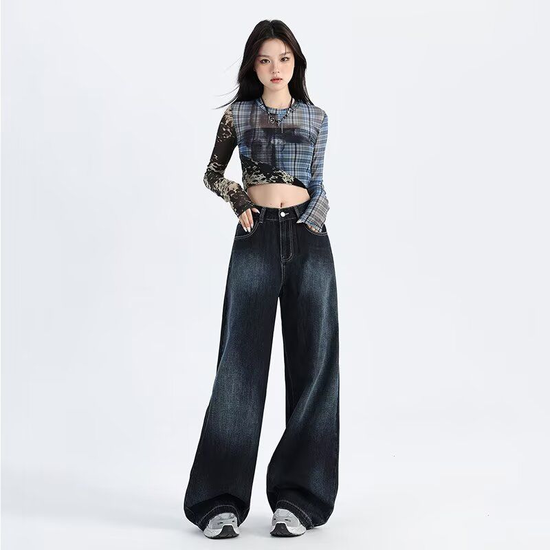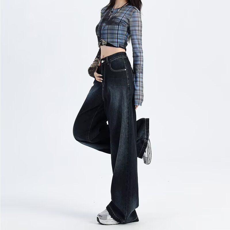 黑灰色加绒牛仔裤女秋冬季2024年新款潮百搭高腰显瘦宽松直筒裤子