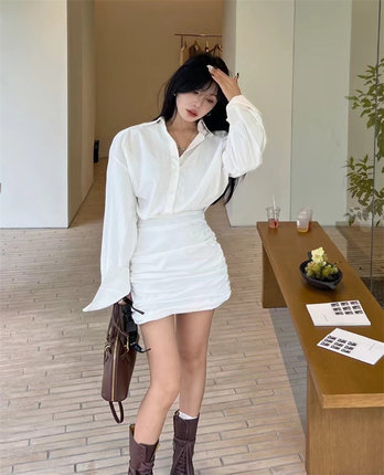 特价秋装新款白色轻奢高级感衬衫式长袖连衣裙小个子褶皱包臀短裙