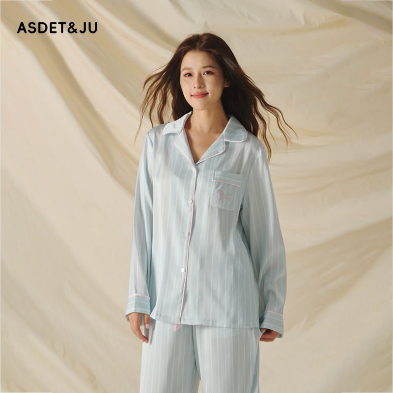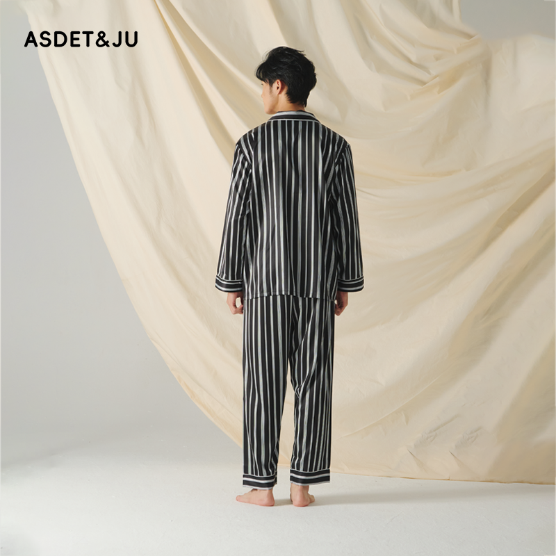 男条纹仿真丝丝滑长袖长裤家居服