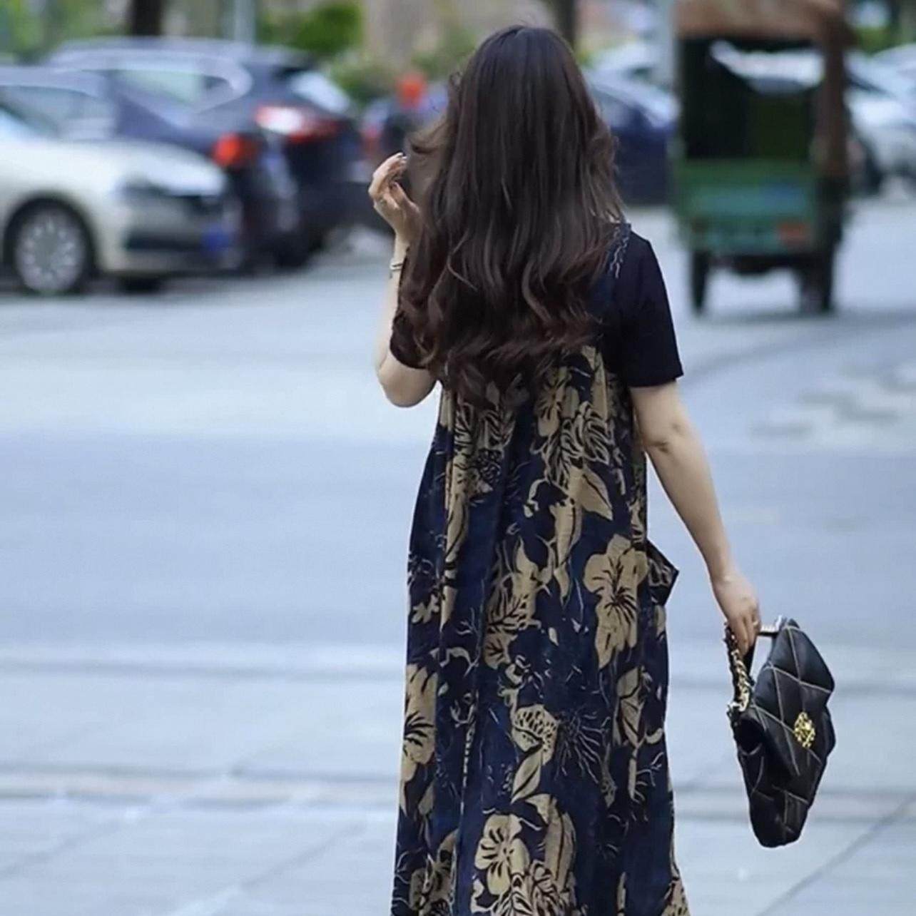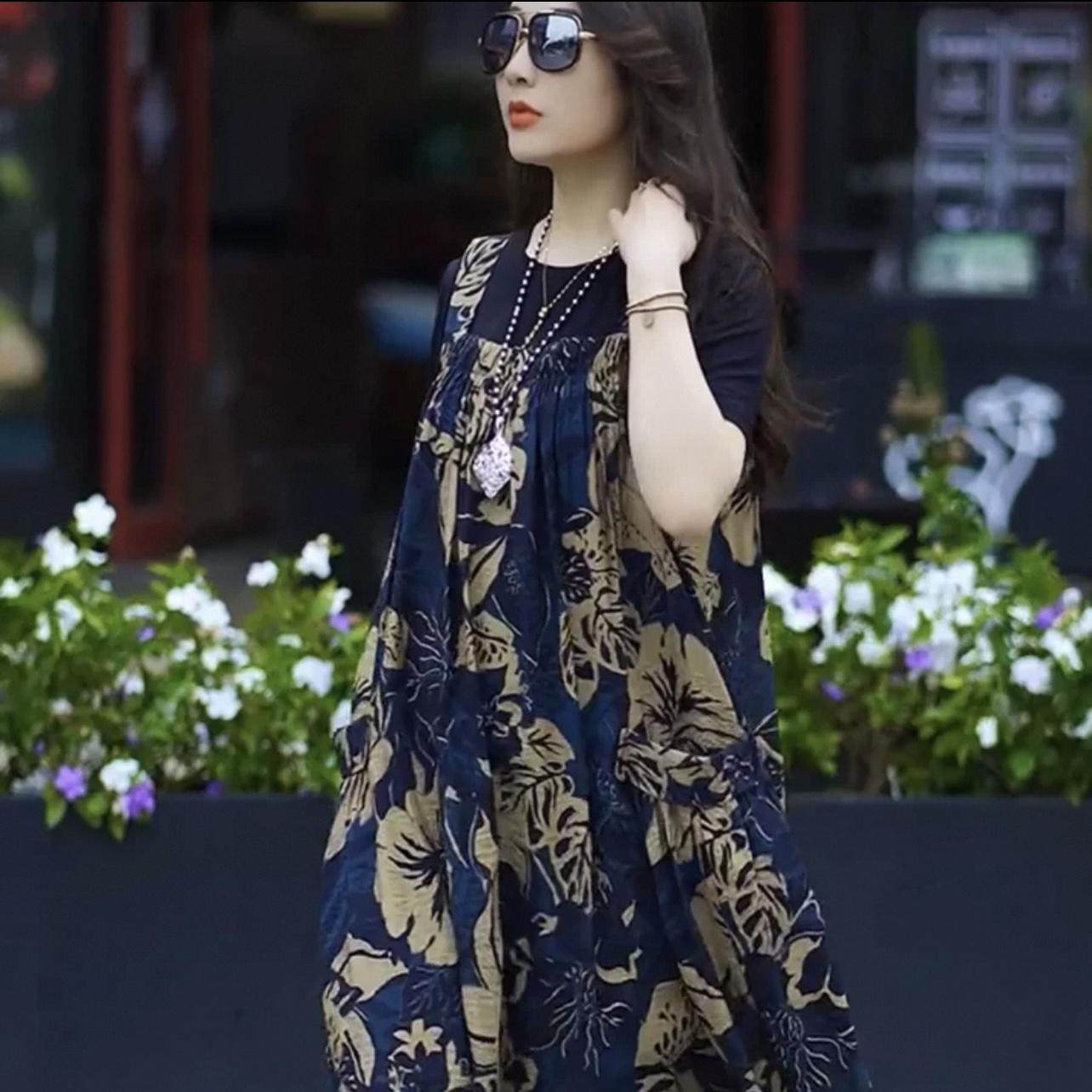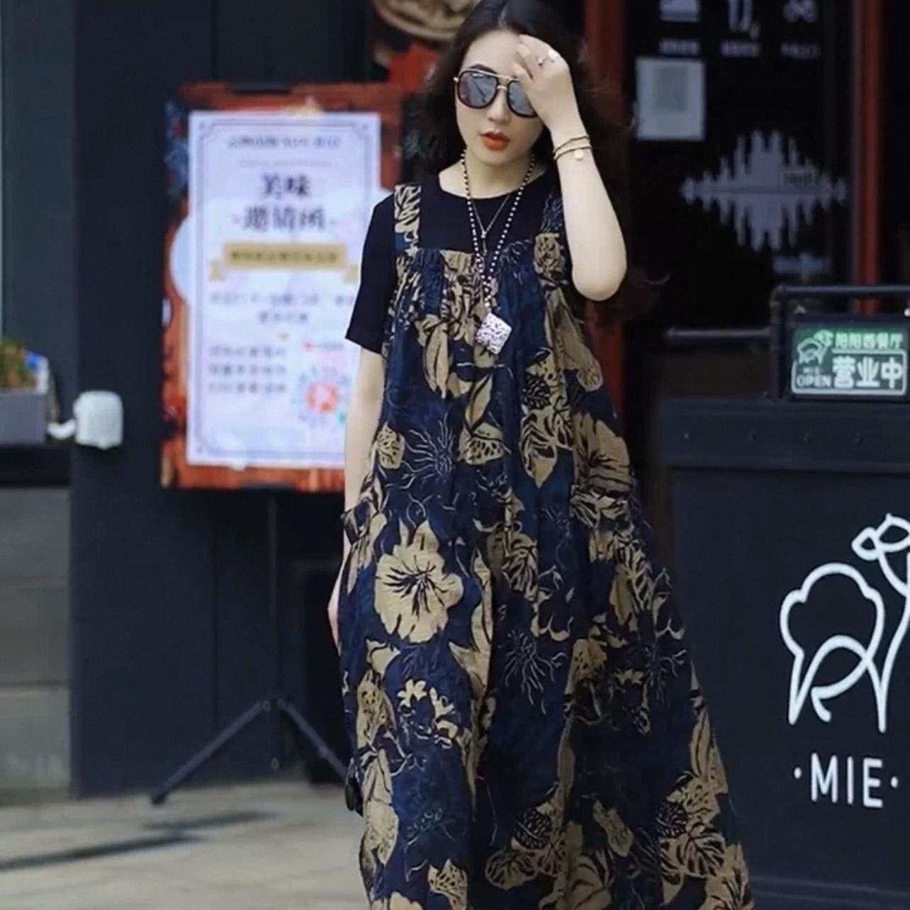 2025夏季新款宽松气质大码背带裙女装减龄真丝印花过膝长裙两件套