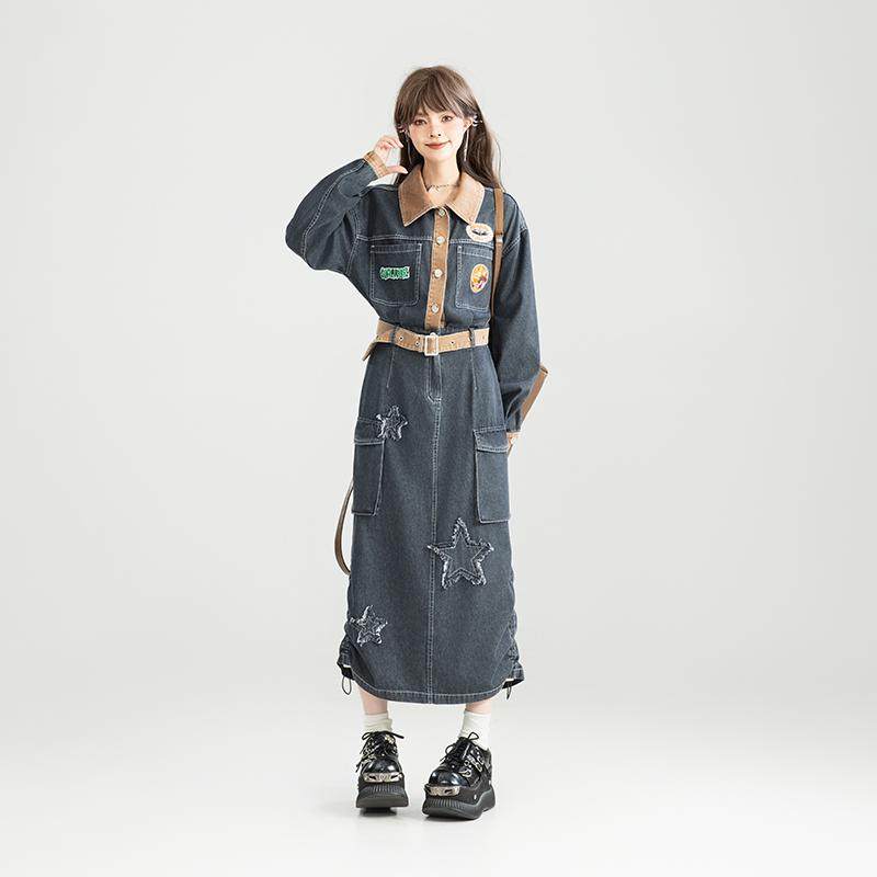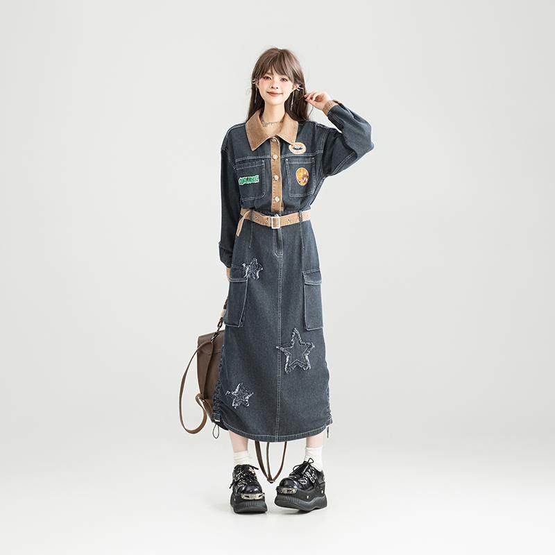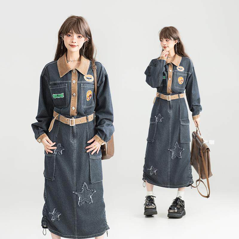 KEIKO [绣标]工装复古风轻薄牛仔连衣裙25秋季美式系带显瘦连身裙