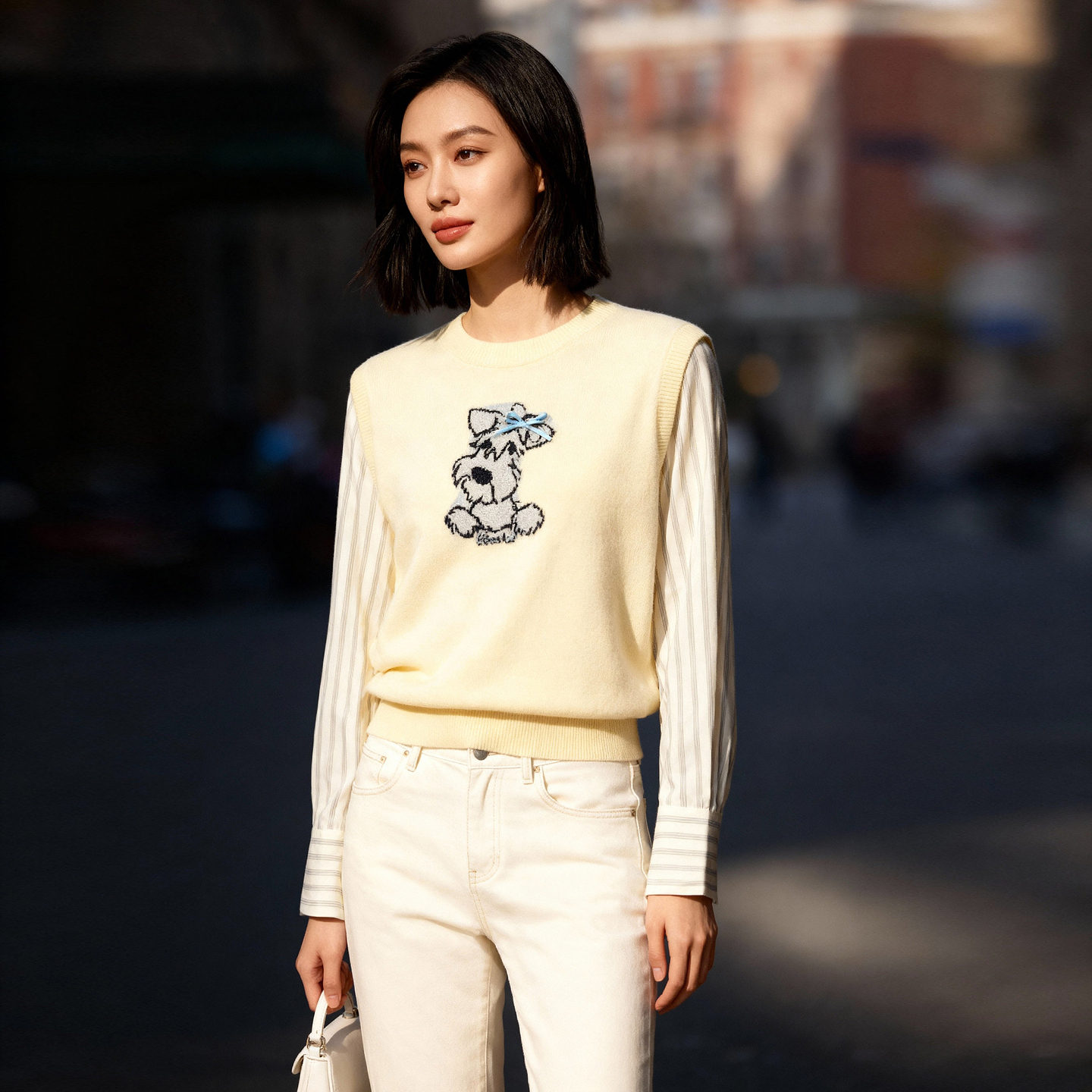 Basic House/百家好25秋冬撞色拼接条纹长袖小狗刺绣设计感针织衫