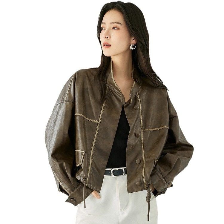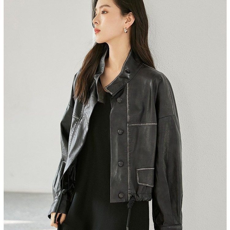 对白气质立领短款风衣外套女2025春装新款抽绳高级感通勤皮衣夹克
