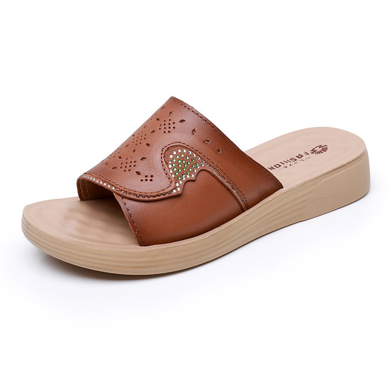 头层牛皮厚底舒适凉拖女软底防滑妈妈外穿拖鞋真皮夏季坡跟一字拖