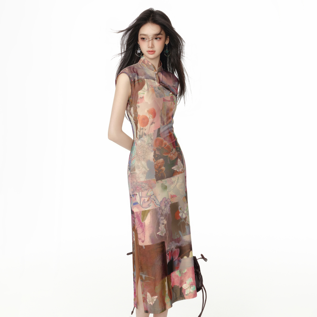 EPTISON新中式连衣裙女2025夏季新款复古修身波嬉风印花旗袍长裙