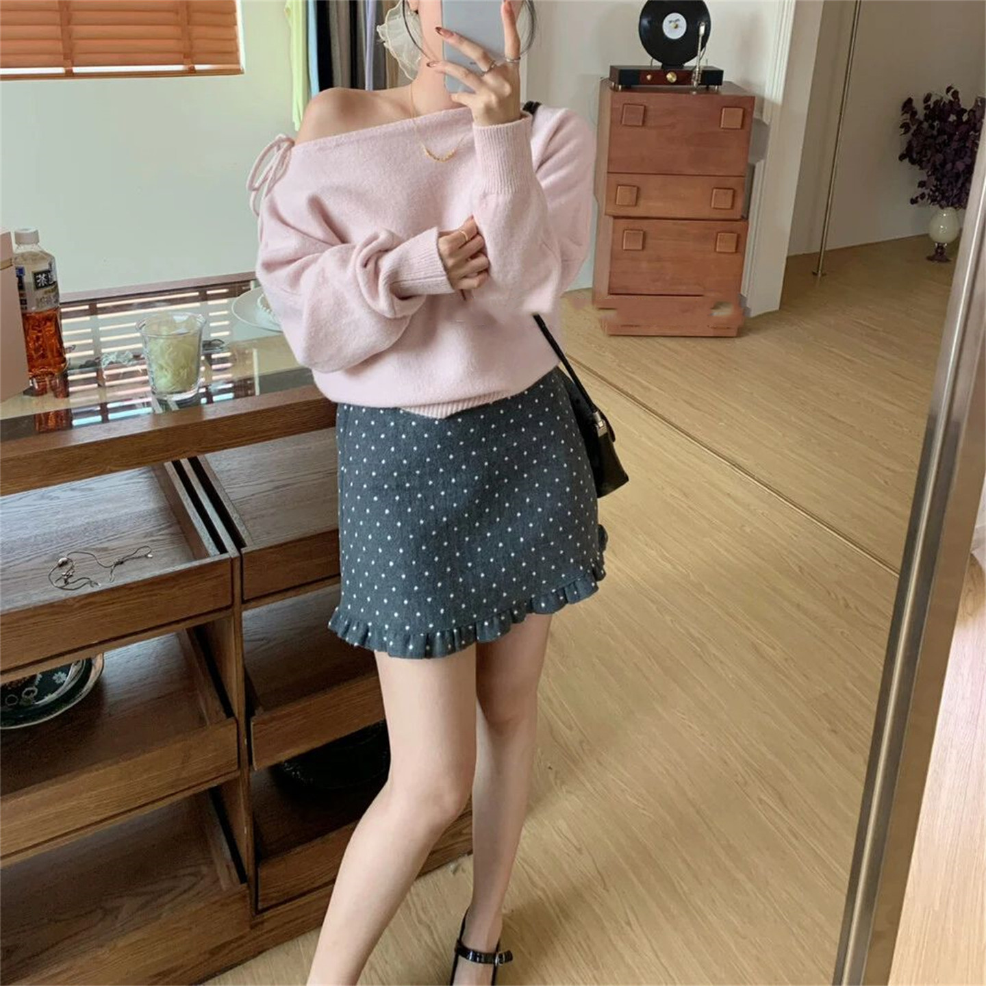 波点毛呢半身裙高腰木耳边包臀裙