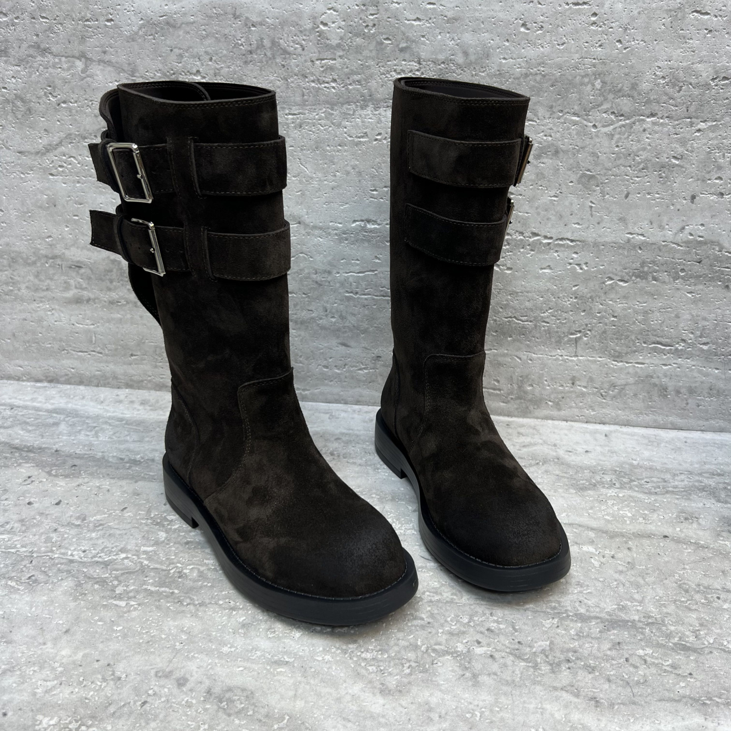 欧洲站欧货棕女鞋2025秋季新款低跟圆头皮带扣骑士靴套筒中筒靴女