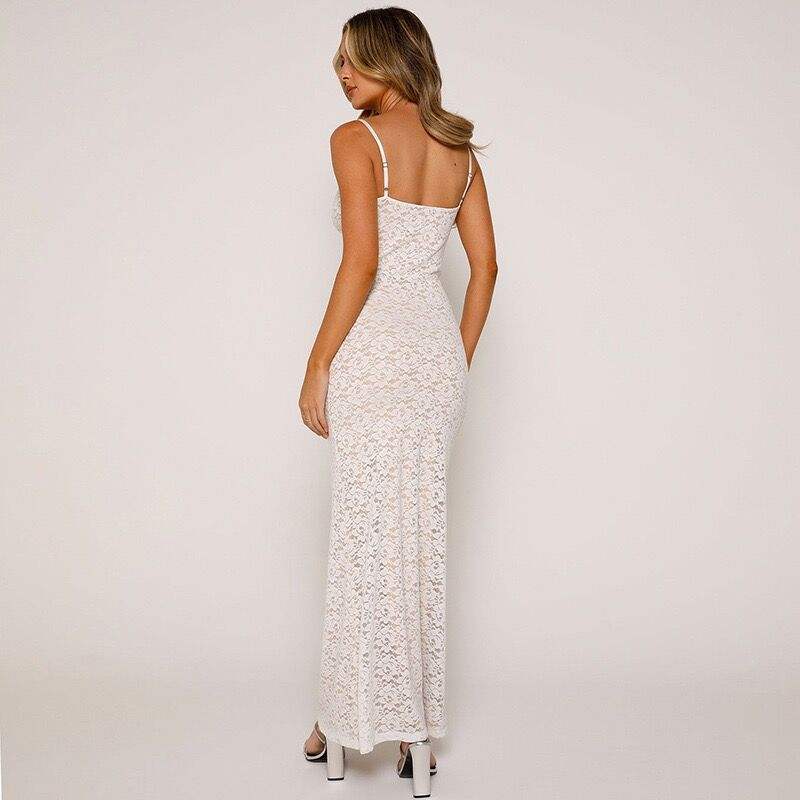 外贸欧美夏季透明长裙修身纯色性感无袖吊带蕾丝连衣裙女包臀裙