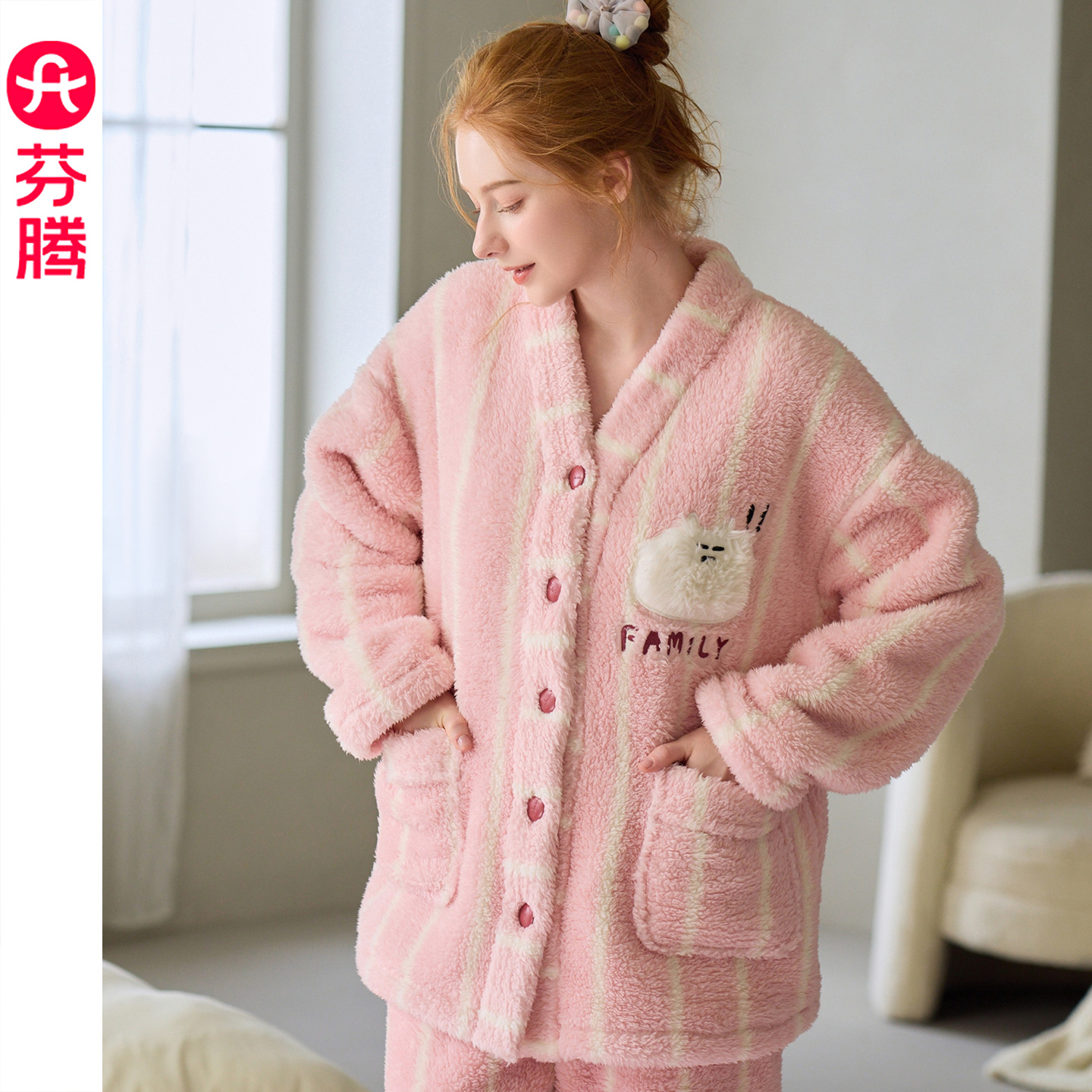 芬腾珊瑚绒睡衣女秋冬季大口袋条纹卡通可爱外穿家居服套装2025年