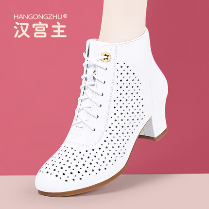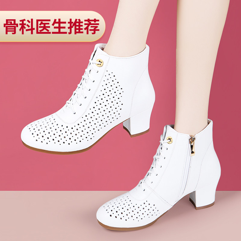 新款春秋舒适透气女靴子中跟单靴镂空短靴透气马丁靴粗跟白色女鞋