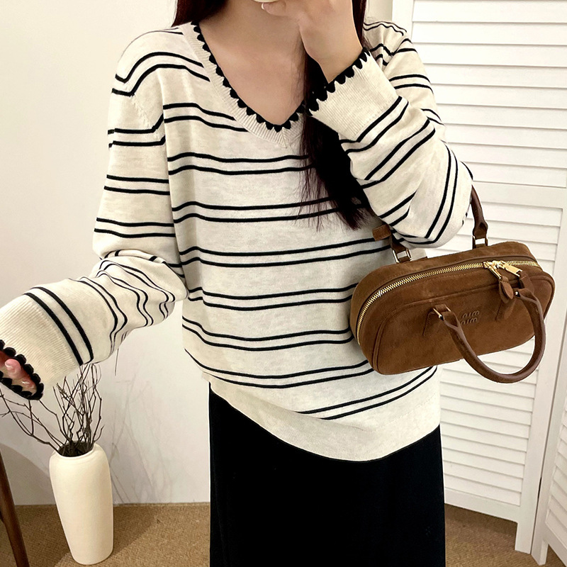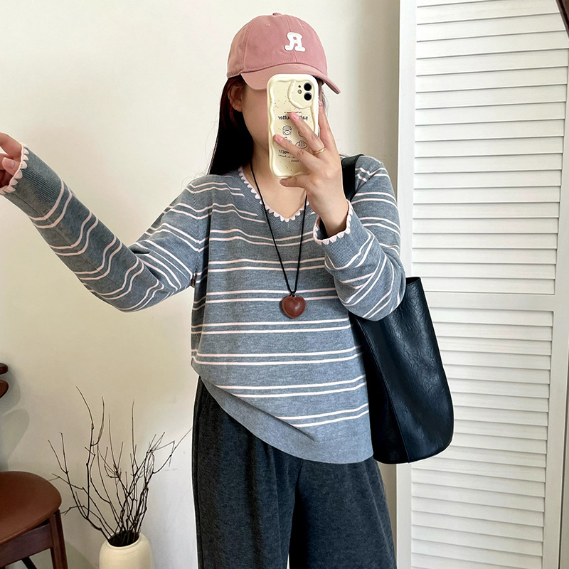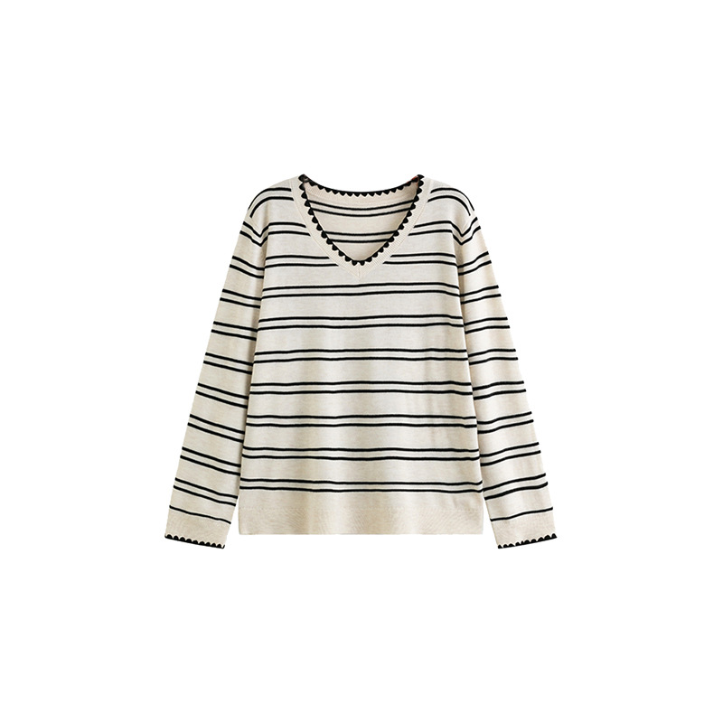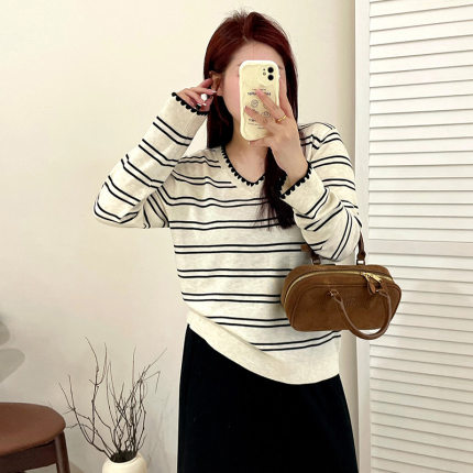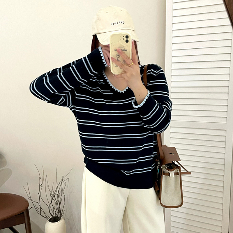 乃粒23129大码女装撞色v领长袖上衣女条纹衫2025秋胖mm显瘦针织衫