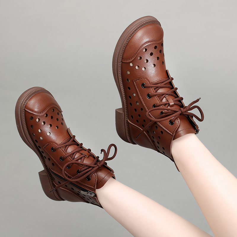 镂空真皮鞋夏季薄款透气马丁靴女凉鞋中年妈妈鞋平底洞洞短靴大码
