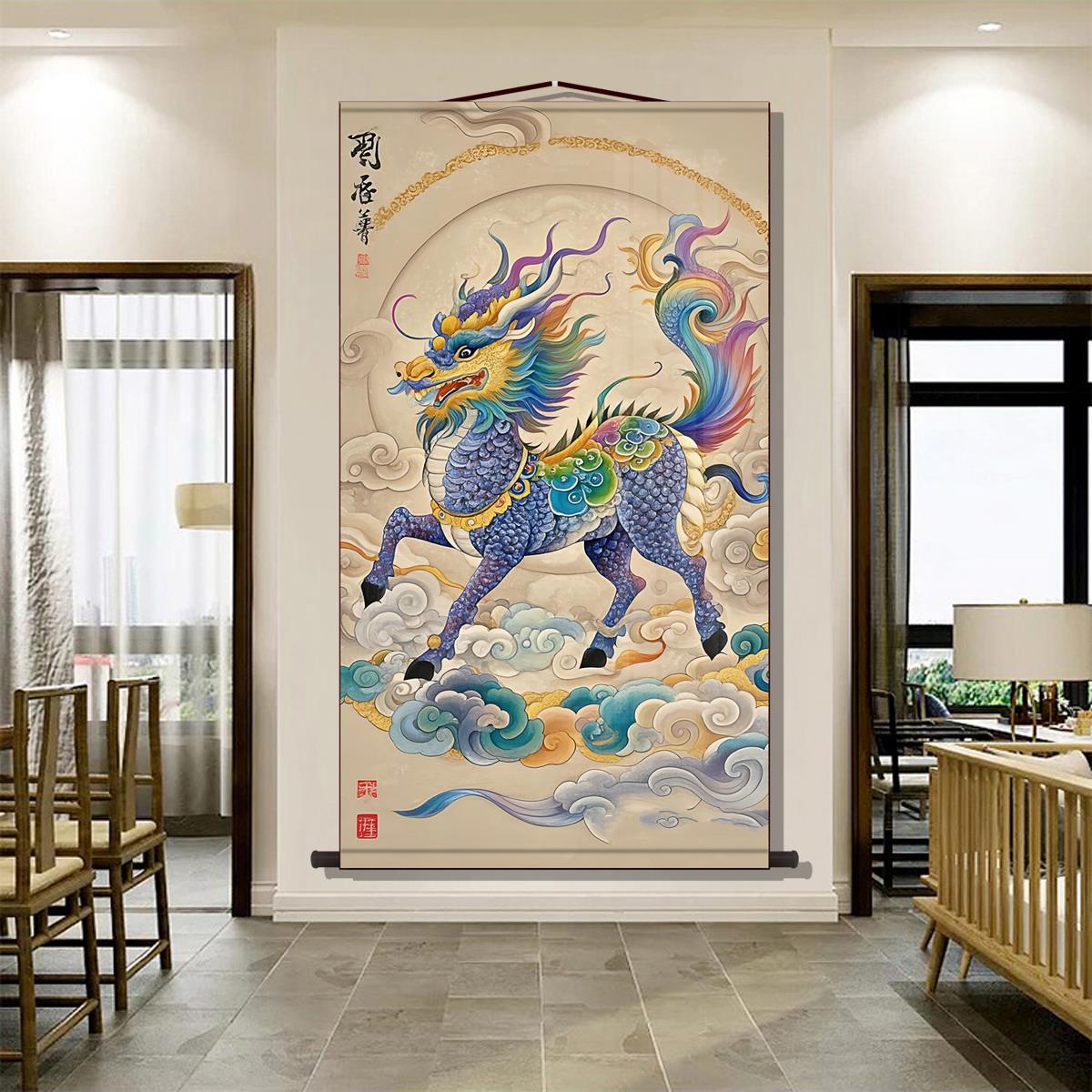 麒麟挂画玄关装饰画高档新中式风水走廊过道进门招财壁画2024新款