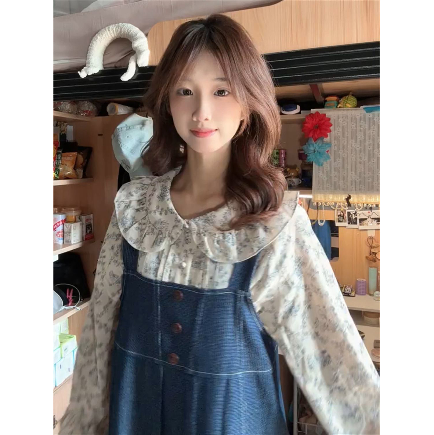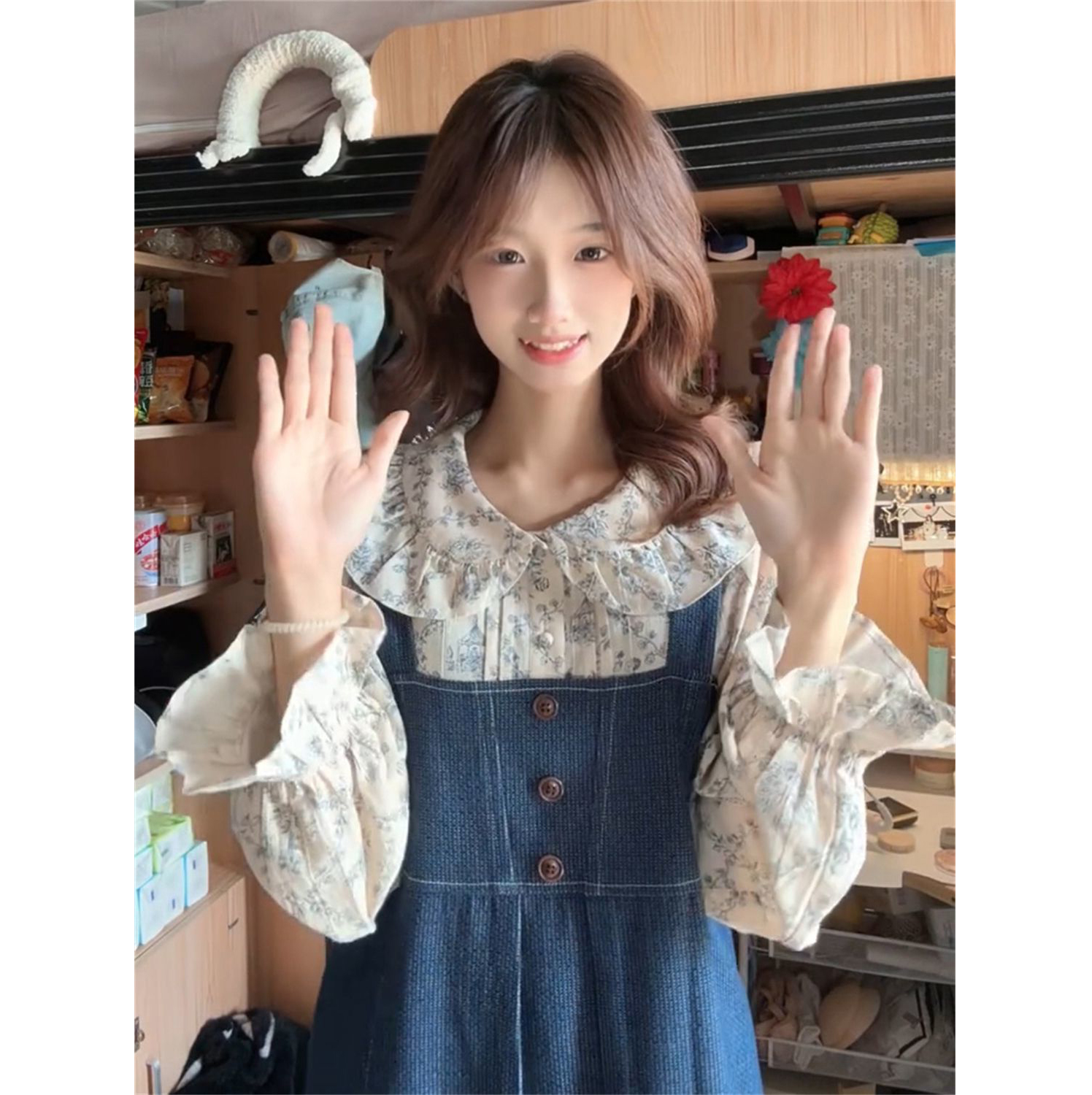 法式软妹简约牛仔吊带背带裙女学生+娃娃领碎花宽松长袖衬衫套装