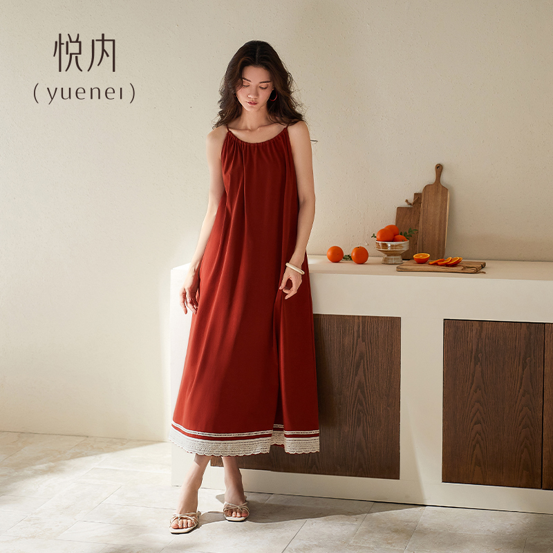 悦内带胸垫一体吊带睡裙女睡衣夏季夏天纯棉长款高级感可外穿红色