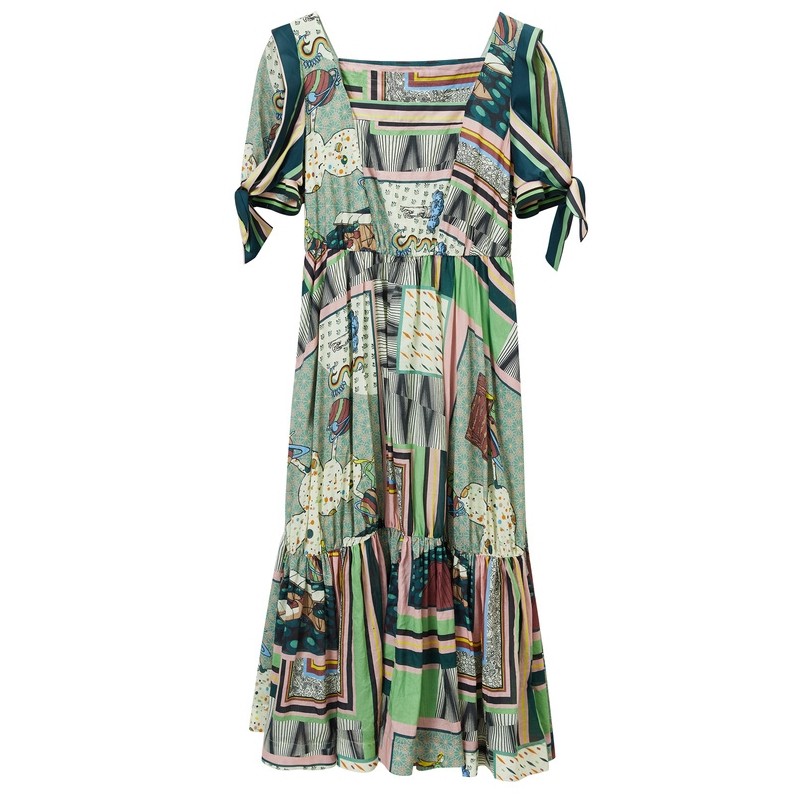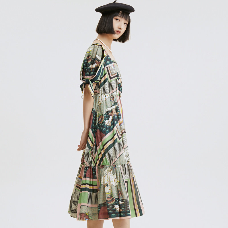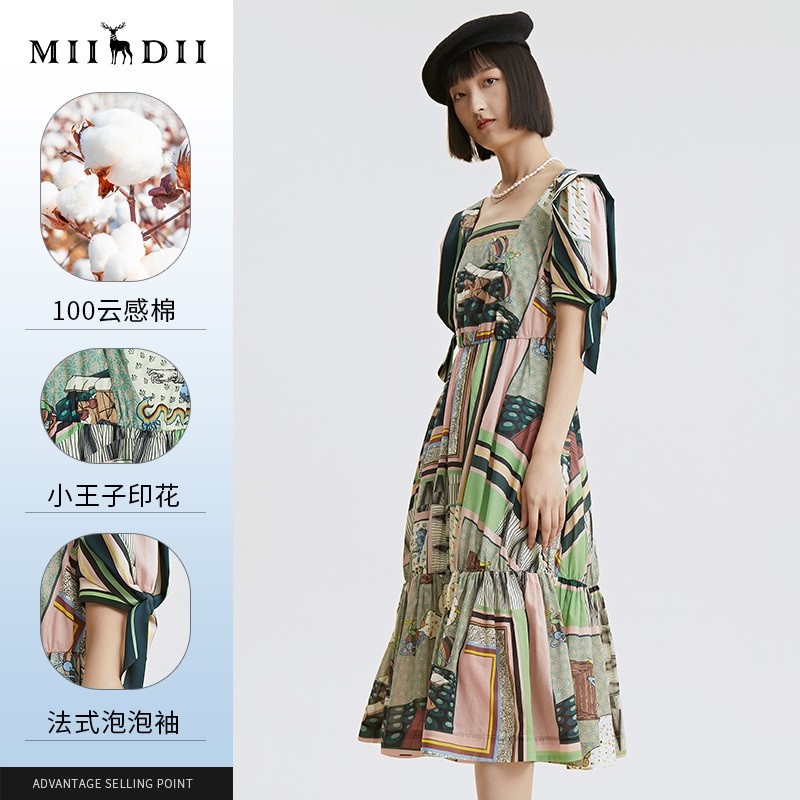 谜底连衣裙2022夏新款方领甜美纯棉印花泡泡袖收腰长裙225ML6076