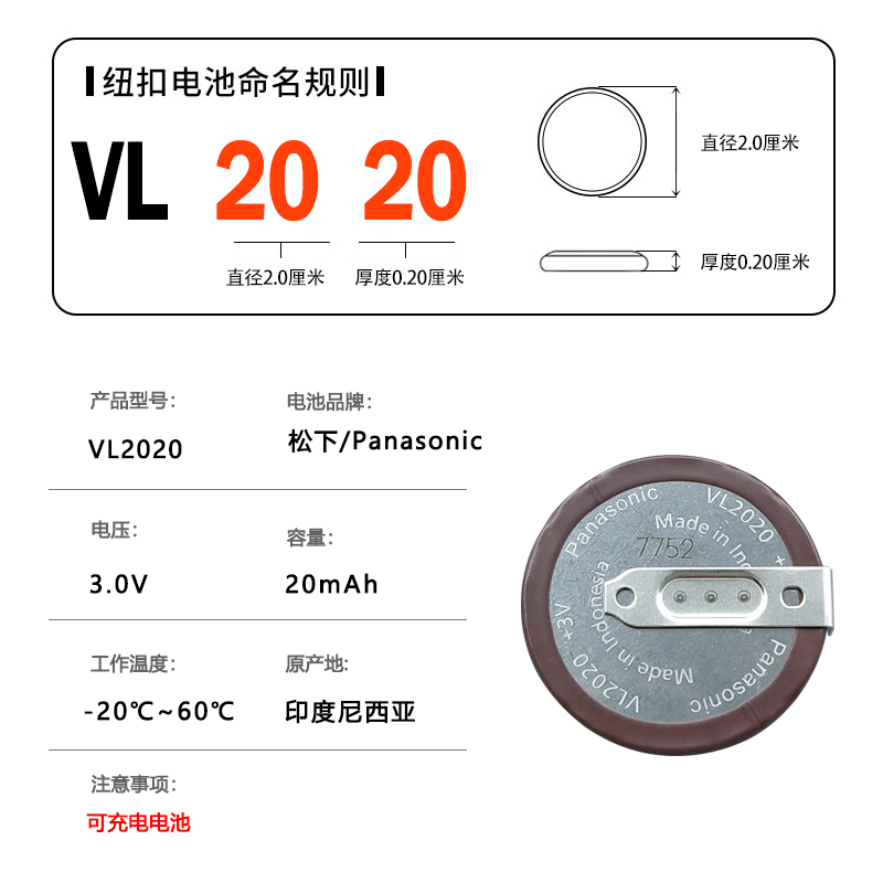 原装松下VL2020 可充电纽扣电池3V迷你mini宝马汽车遥控器钥匙电池带焊脚电路板考勤机ML2020