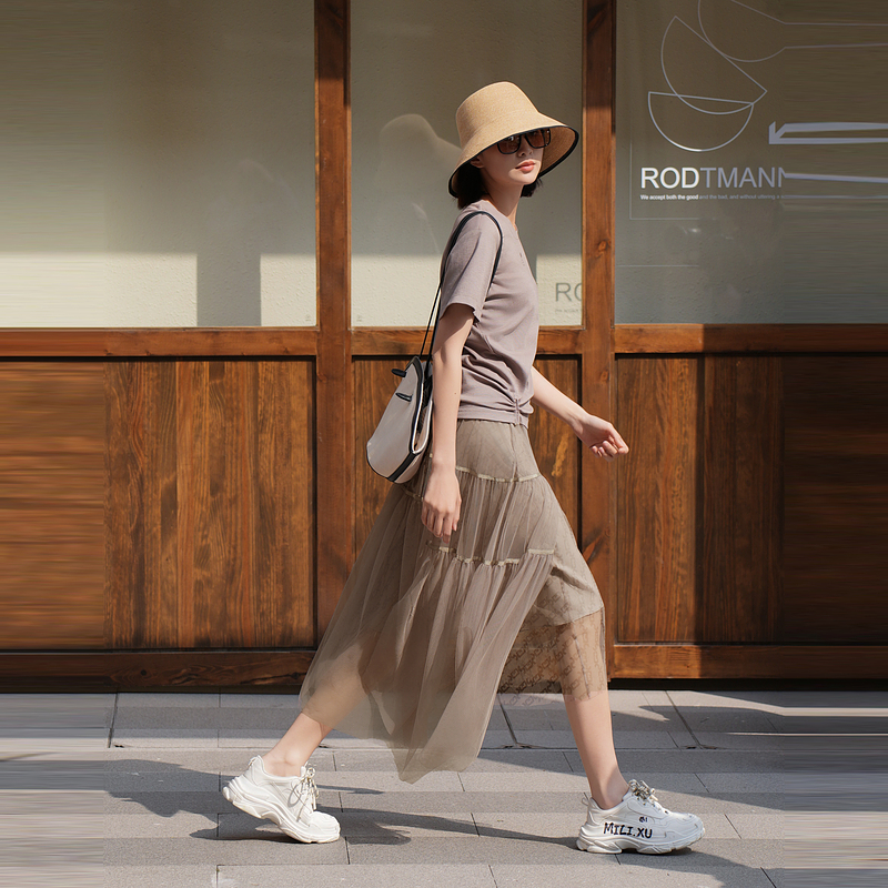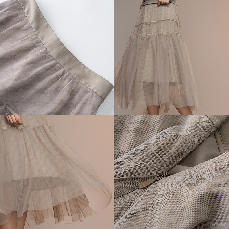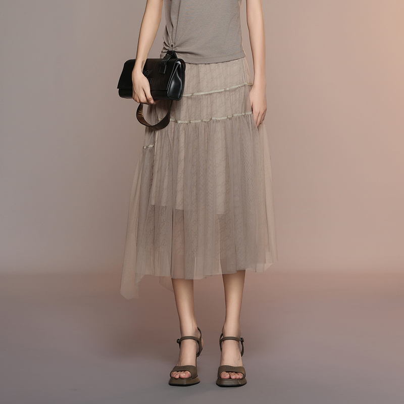 XG雪歌卡其色通勤简约半身裙2025夏季新款不规则网纱设计中长裙女