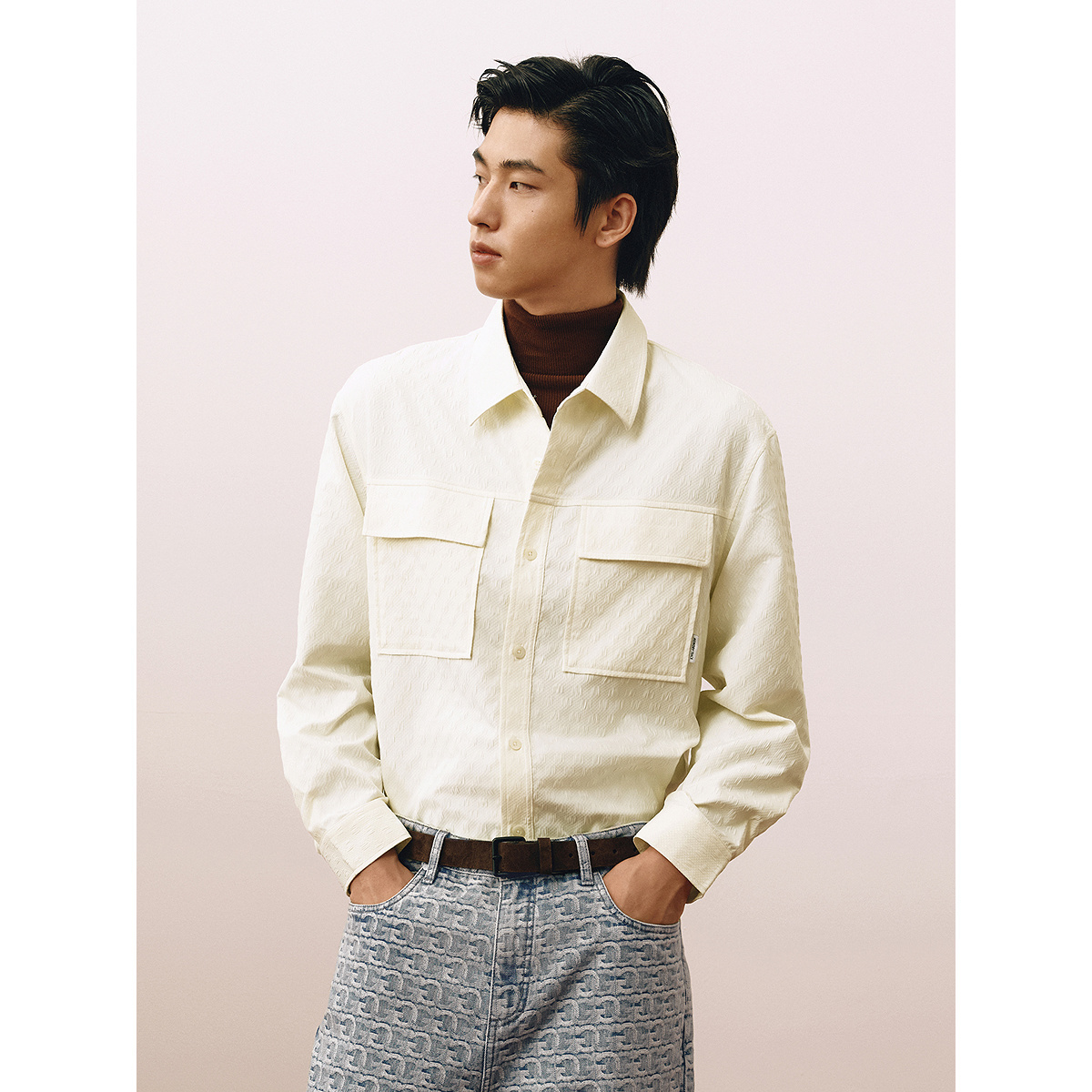 GXG男装胸前泡泡纱口袋长袖衬衫25春新品简约休闲翻领宽松外套男