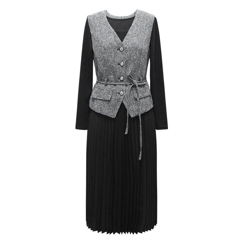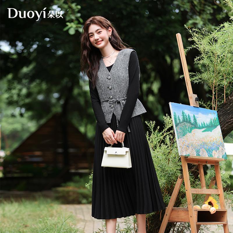 朵以2025春季新款通勤小香风V领马甲系带收腰圆领连衣裙叠搭套装