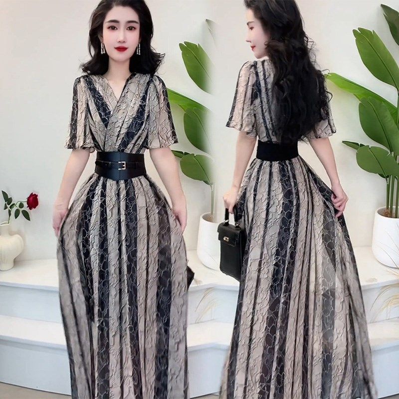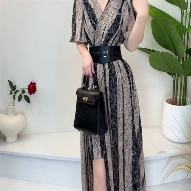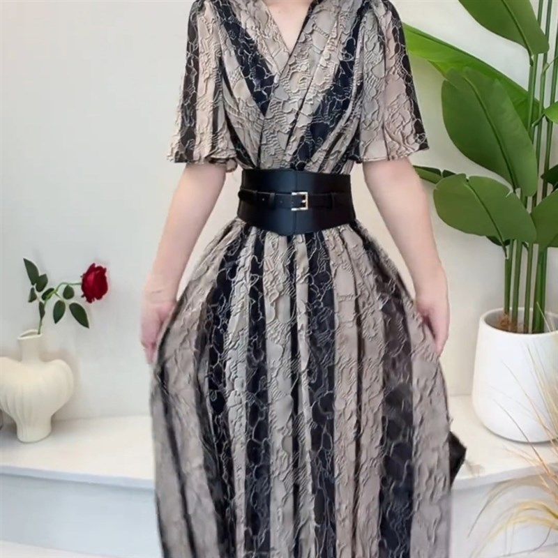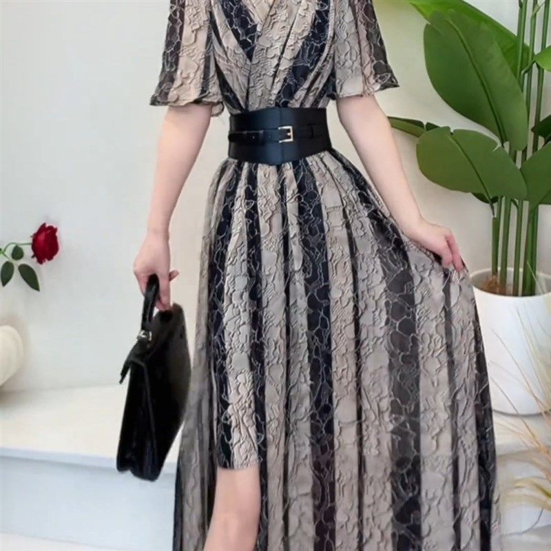 夏季新款法式气质V领收腰显瘦连衣裙女高级感洋气中长款礼服裙子