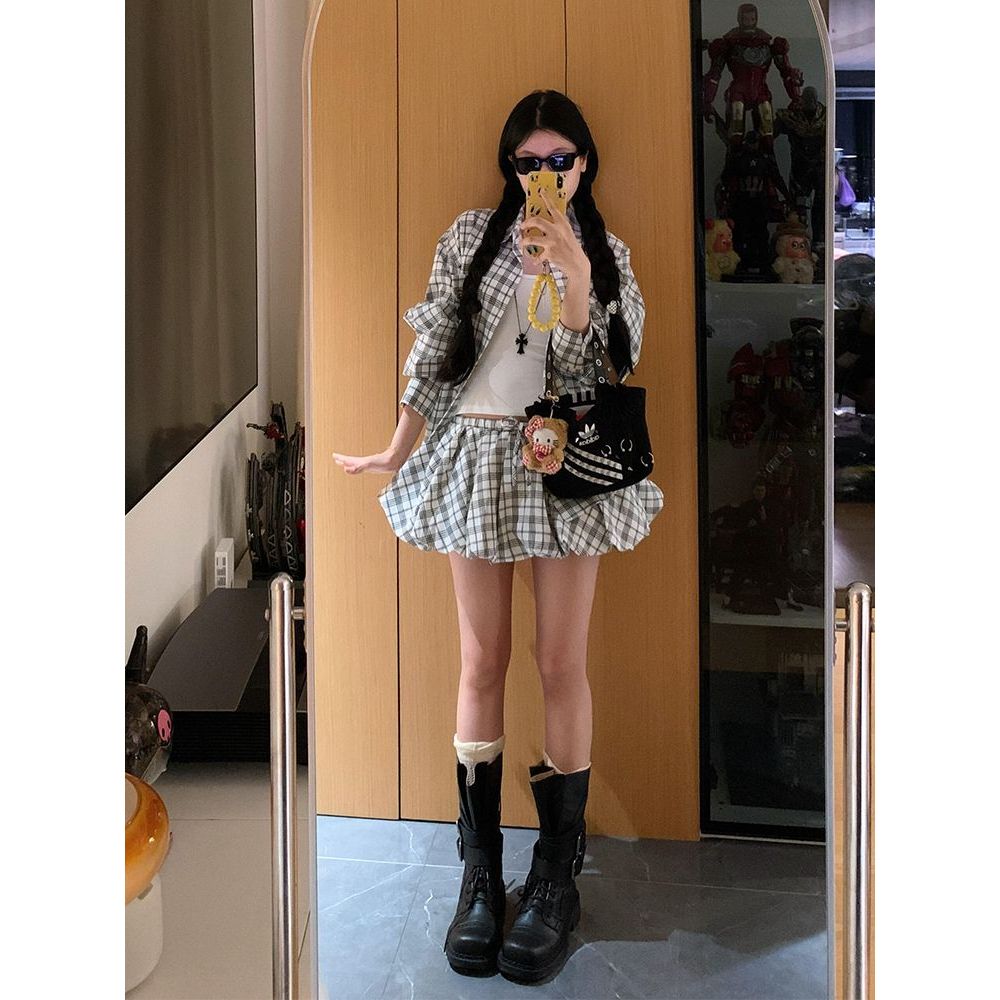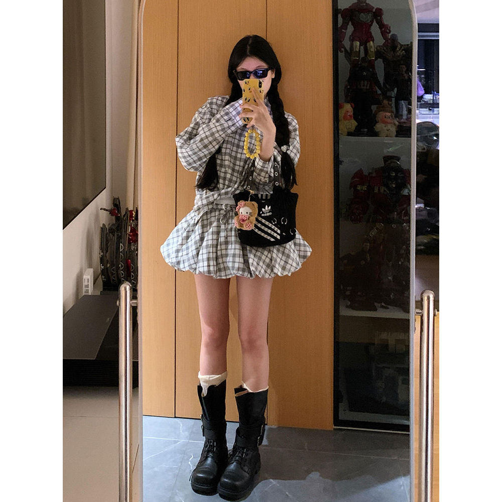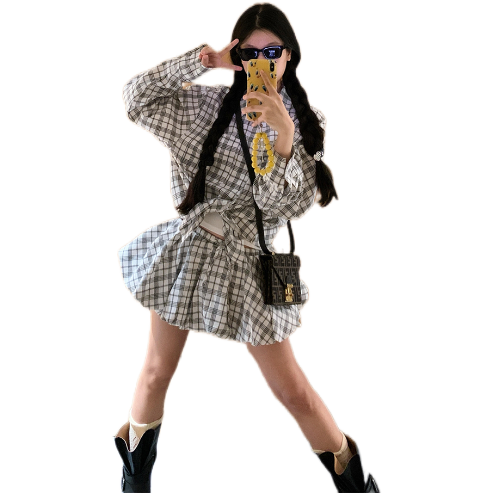 棋盘格 学院时尚格子长袖衬衫花苞秋季韩系半身裙两件套套装