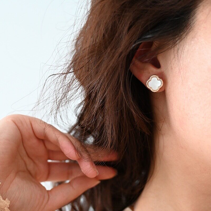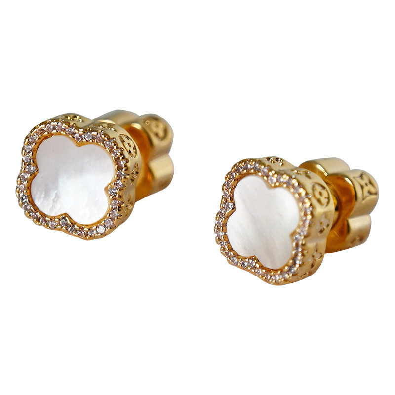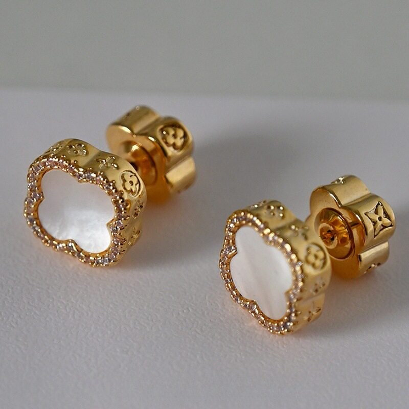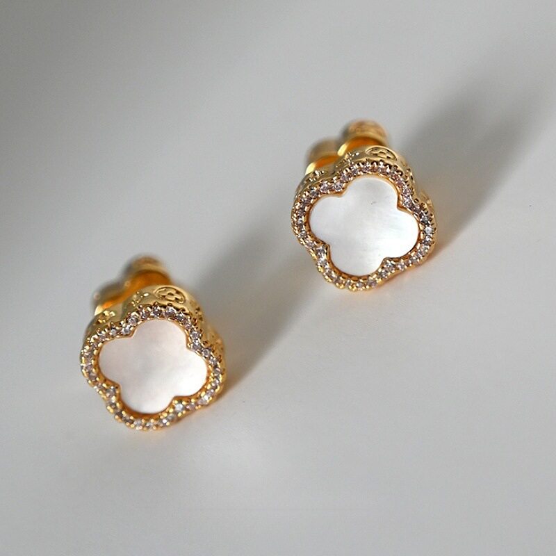 新款简约小香风贝母四叶草耳钉复古时尚大气耳环女精致镶锆高级感