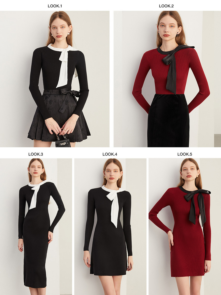 DPLAY秋季法式风撞色圆领长袖修身短款红色针织连衣裙女