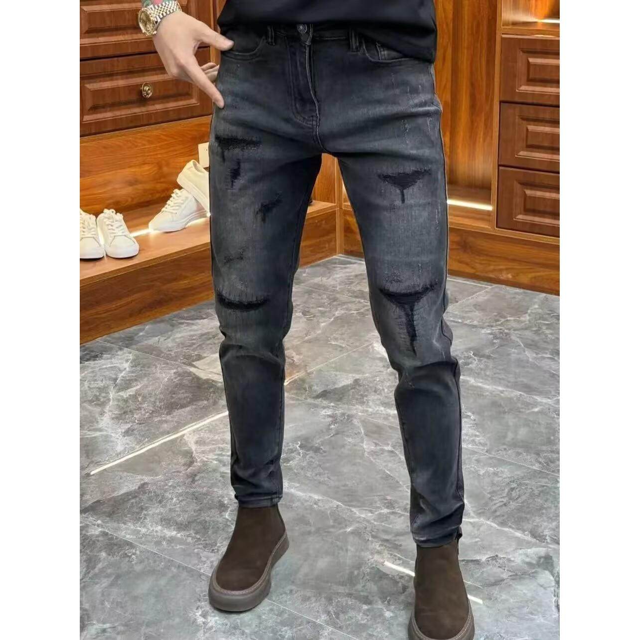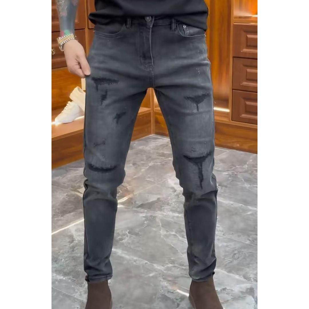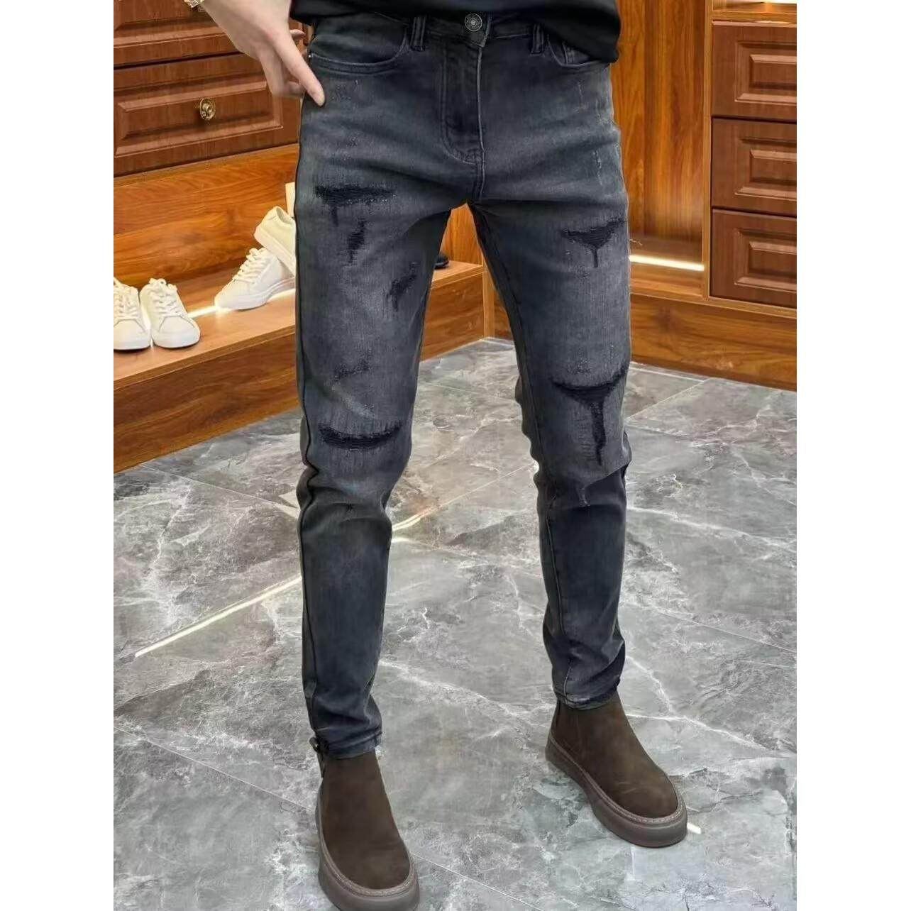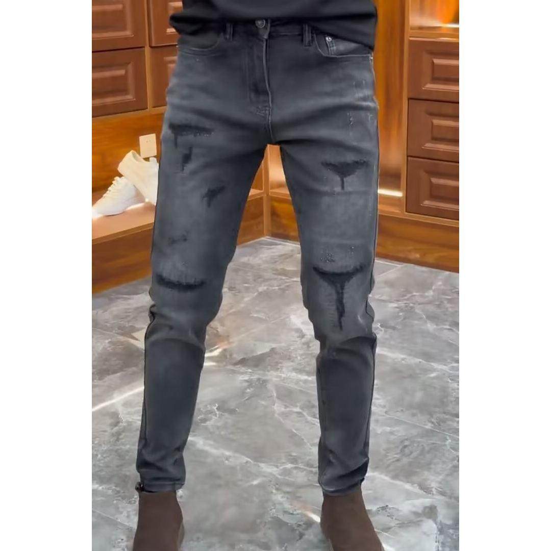 高级感黑灰色修身牛仔裤男破洞补丁秋季新款时尚潮流弹力小脚裤子