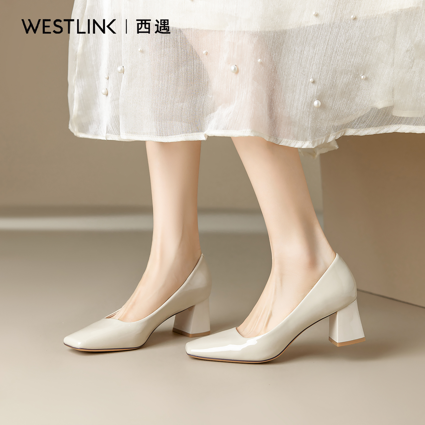 西遇裸色高跟鞋女气质高级不累脚2025新款夏季方头粗跟配裙单鞋A
