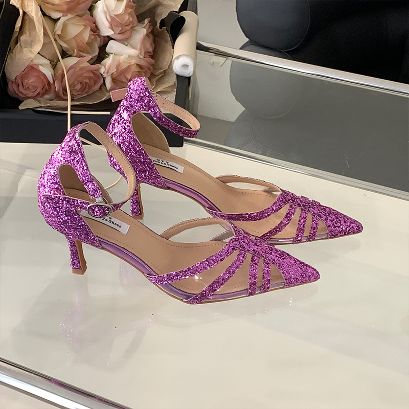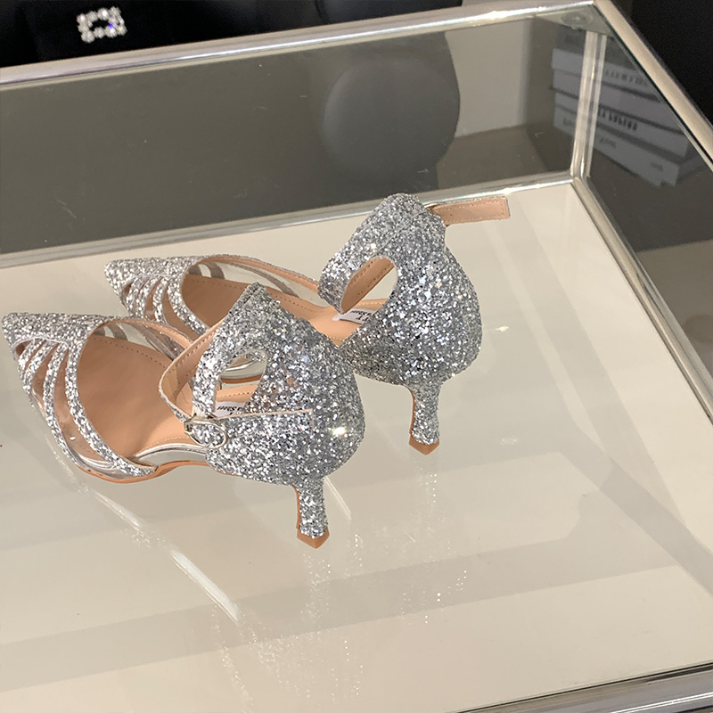 亮片时装凉鞋水钻舒适中跟高跟鞋仙女少女婚宴性感镂空女断码清货