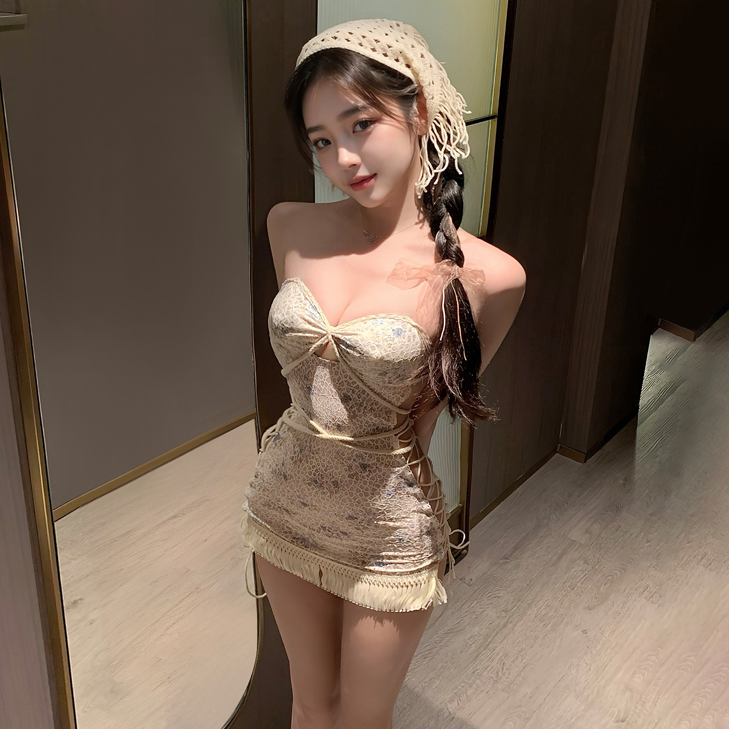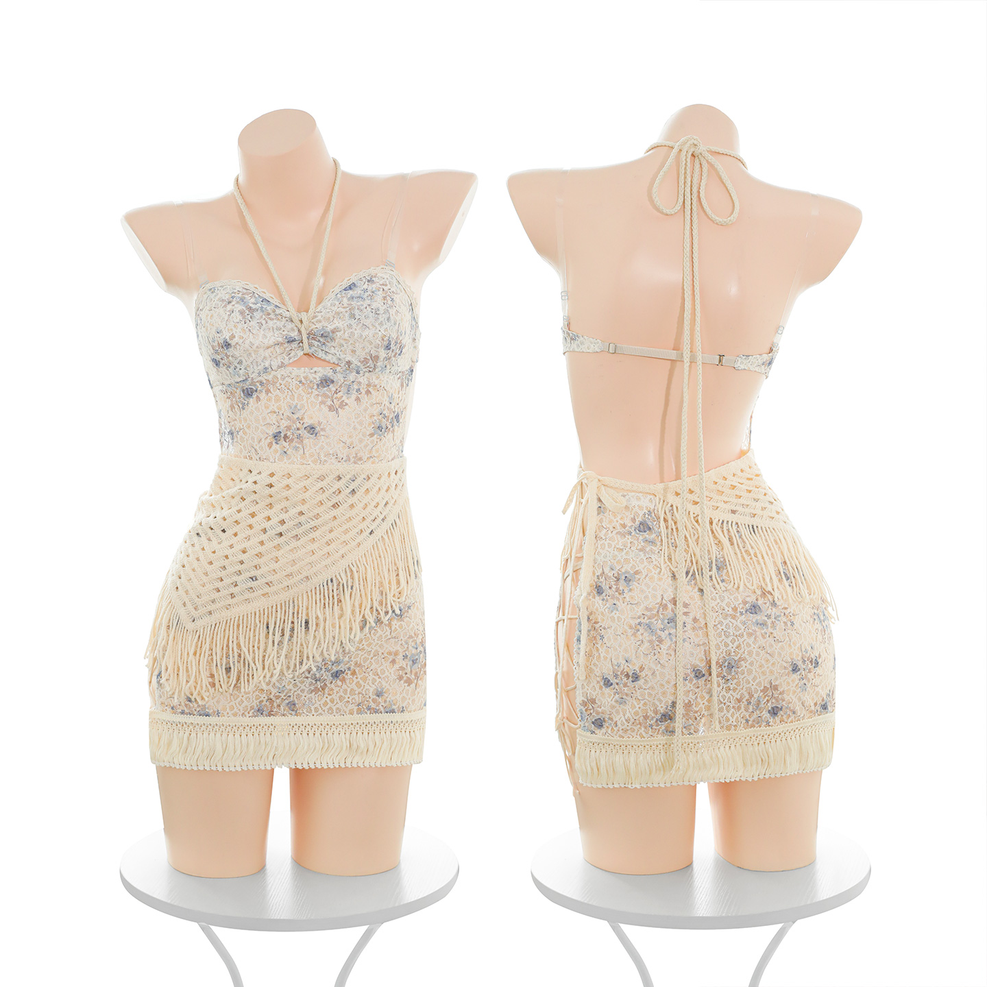 波西米亚度假风碎花连衣裙镂空侧绑带纯欲露臀免脱约会睡裙可外穿