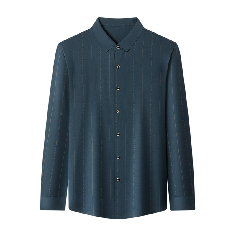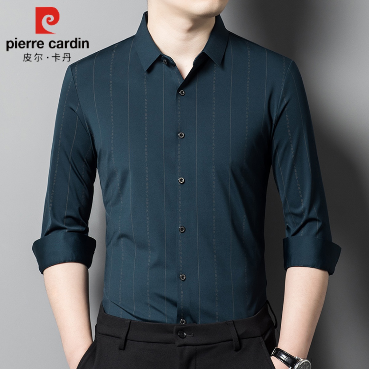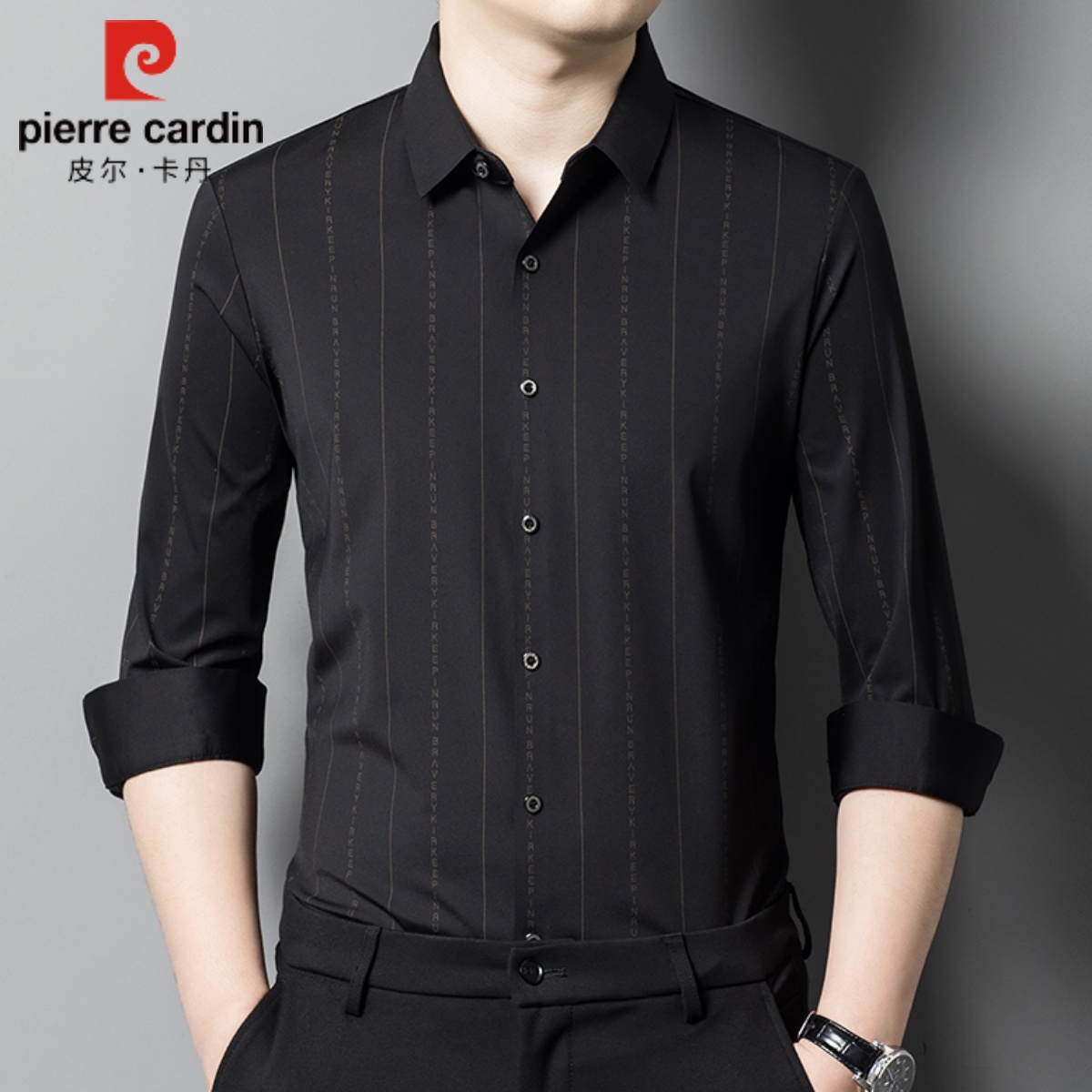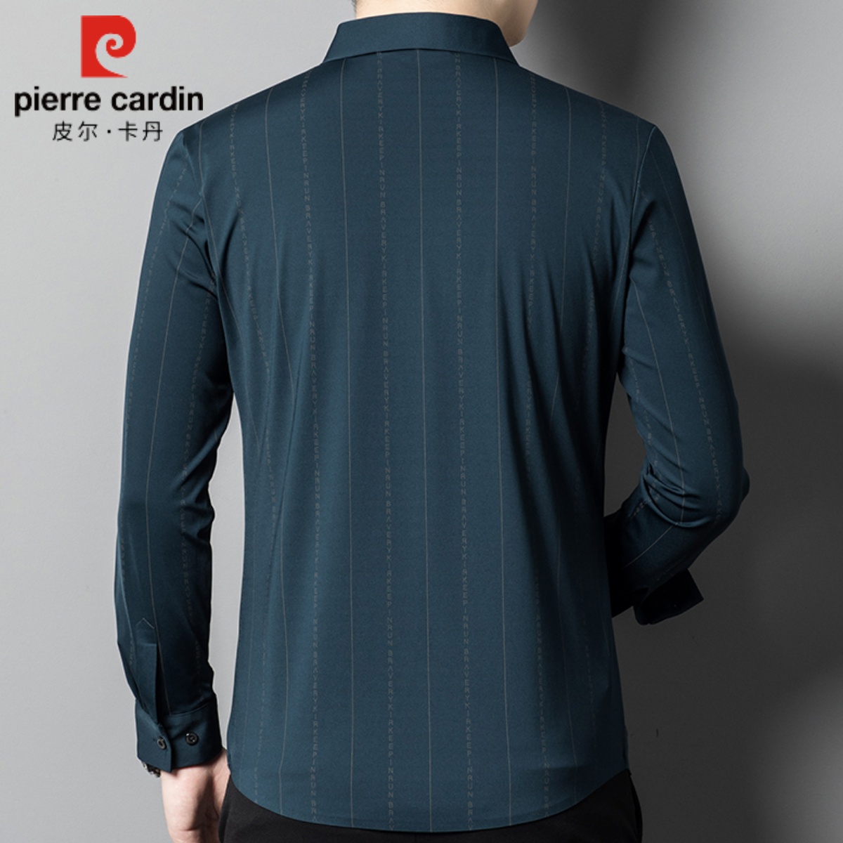 皮尔卡丹高端桑蚕丝男士长袖衬衫中年休闲抗皱免烫商务条纹衬衣男