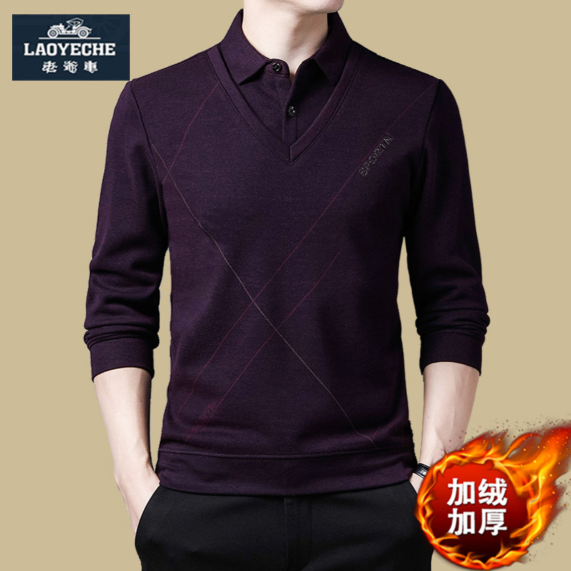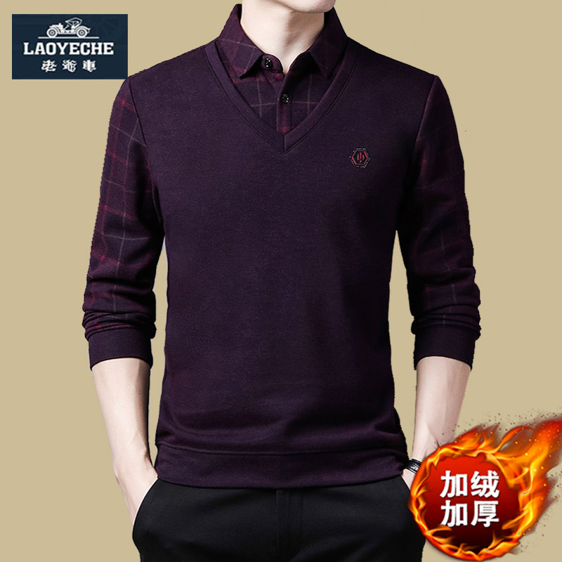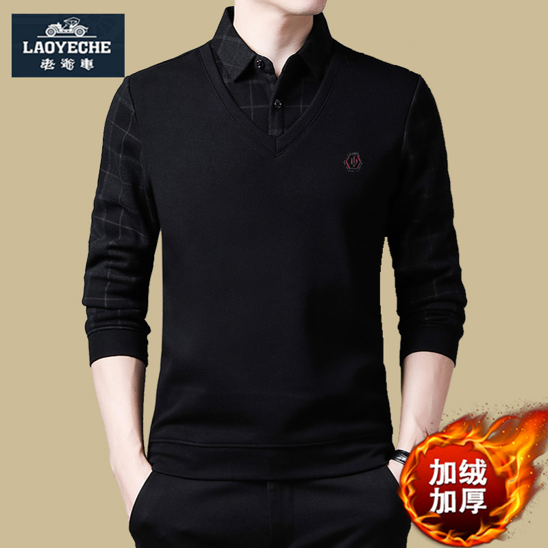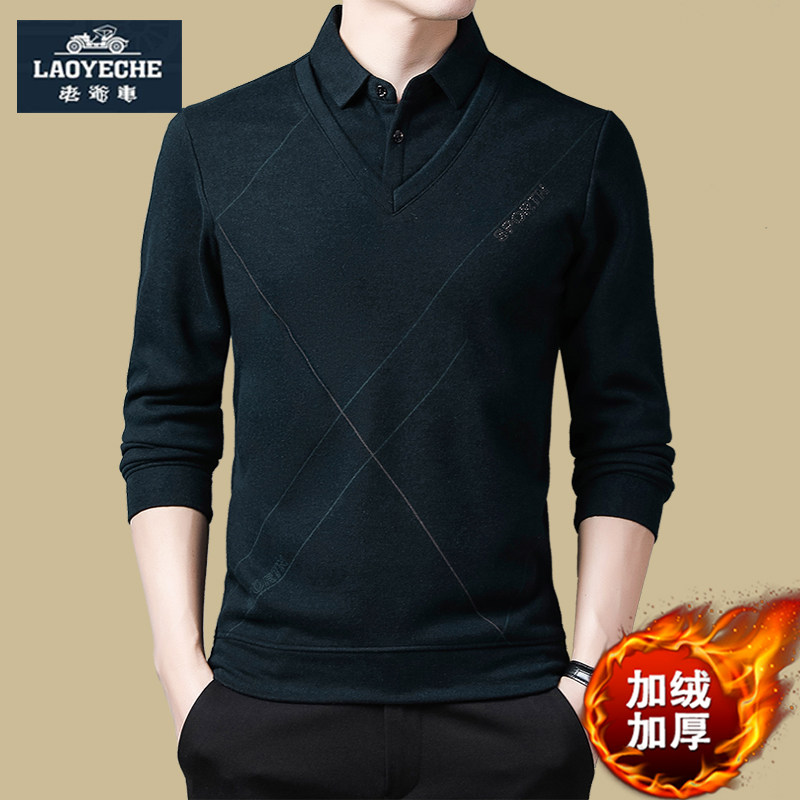 老爷车冬季毛衣爸爸装保暖衬衫假两件加绒加厚上衣男士t恤打底衫