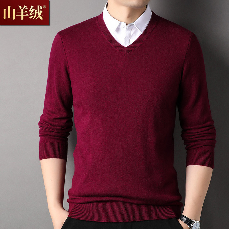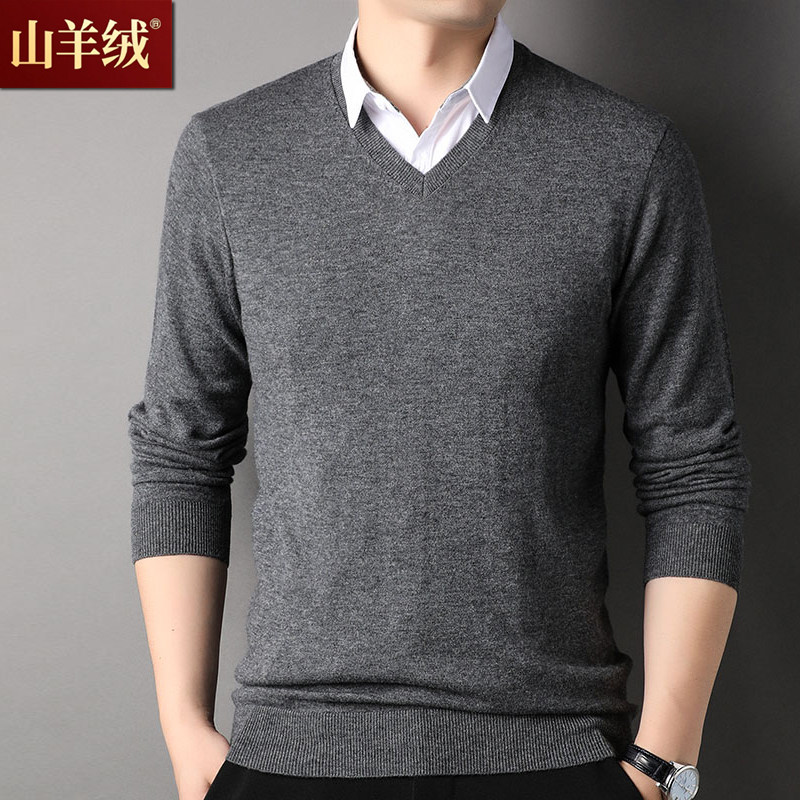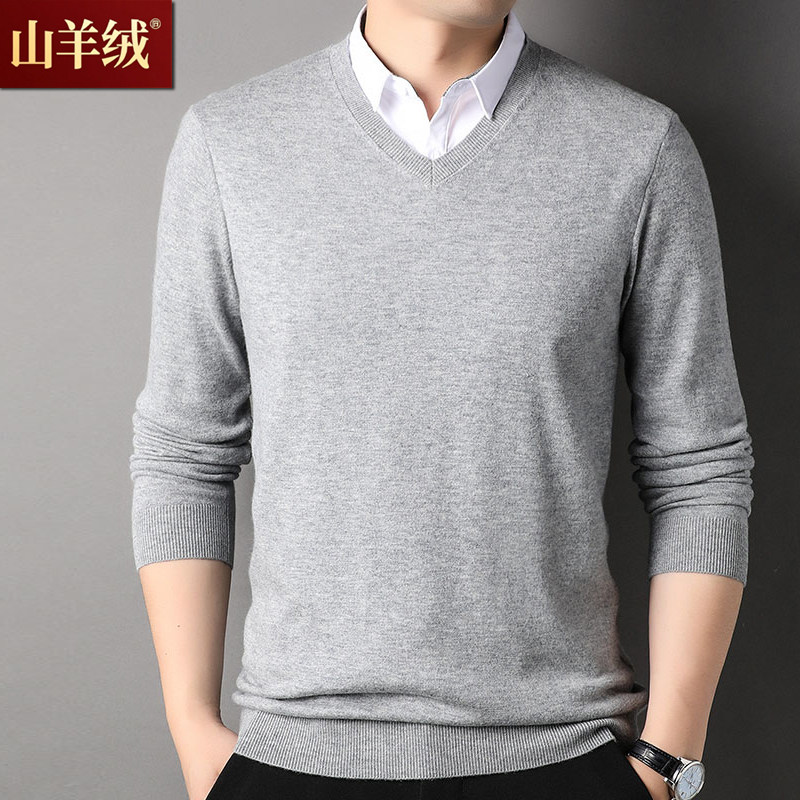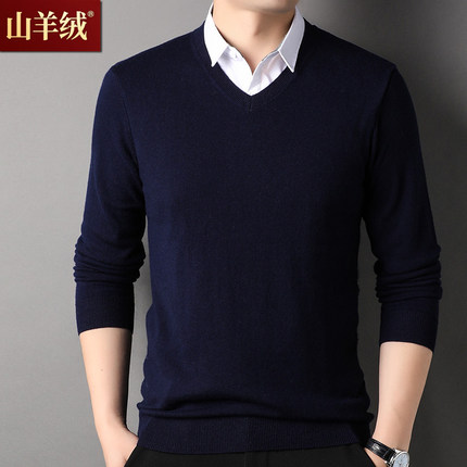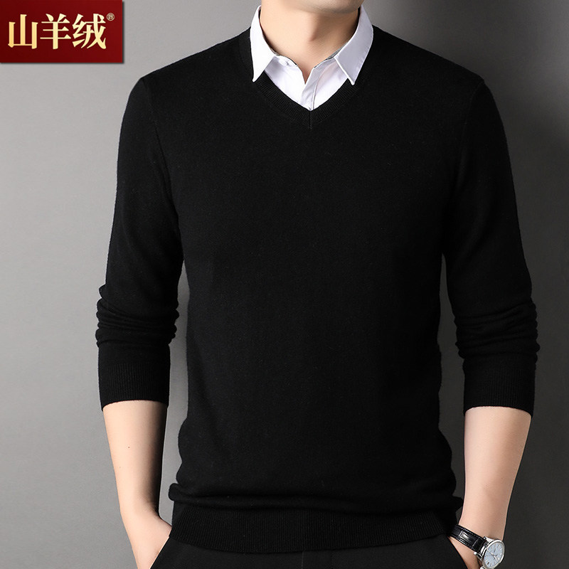 鄂尔多斯市产100羊绒衫冬季鸡心领针织衫衬衫领假两件男士V领毛衣